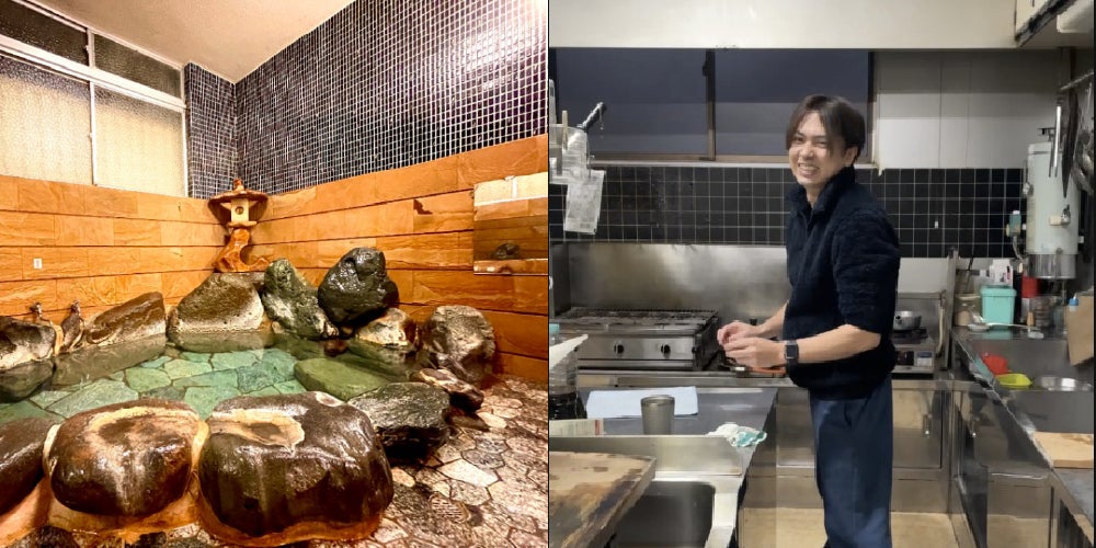 写真:お風呂清掃に取り組む旅行者(静岡県賀茂郡松崎町雲見の民宿「彩雲 俺の家」にて)