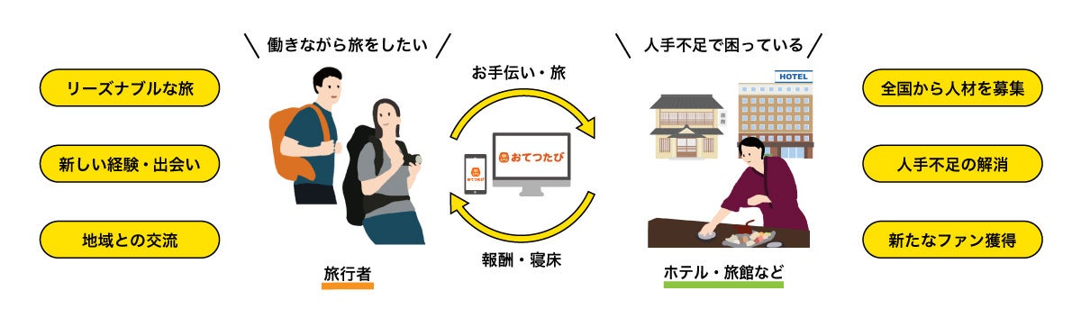 事業者は、旅を切り口にすることで全国各地から人材を集めることが可能です。一方、旅行者もお手伝いすることで報酬を得ることができ、寝床も寮やホームステイのような形で受け入れ側が用意するため宿泊費も無料。空き時間に地域での旅を楽しむことが可能です(交通費は自己負担)。