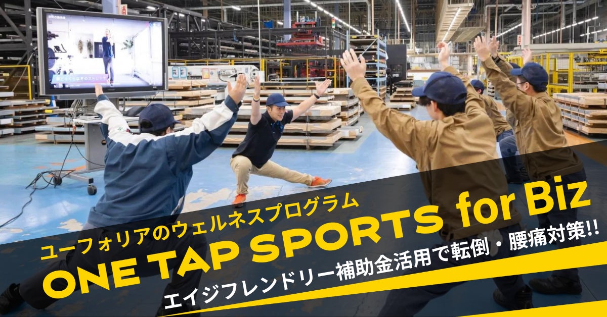 スポーツテック企業の株式会社ユーフォリア(本社:東京都千代田区、共同代表:橋口 寛/宮田 誠、以下 ユーフォリア)が提供する転倒防止・腰痛予防プログラム「ONE TAP SPORTS for Biz」が、厚生労働省の「エイジフレンドリー補助金」を活用することで4分の1の価格(4分の3を補助)で導入できることをご案内いたします。ユーフォリア提供のプログラムは、アスリートのサポート経験がある産業トレーナーが、従業員の身体機能改善サポートを行います。