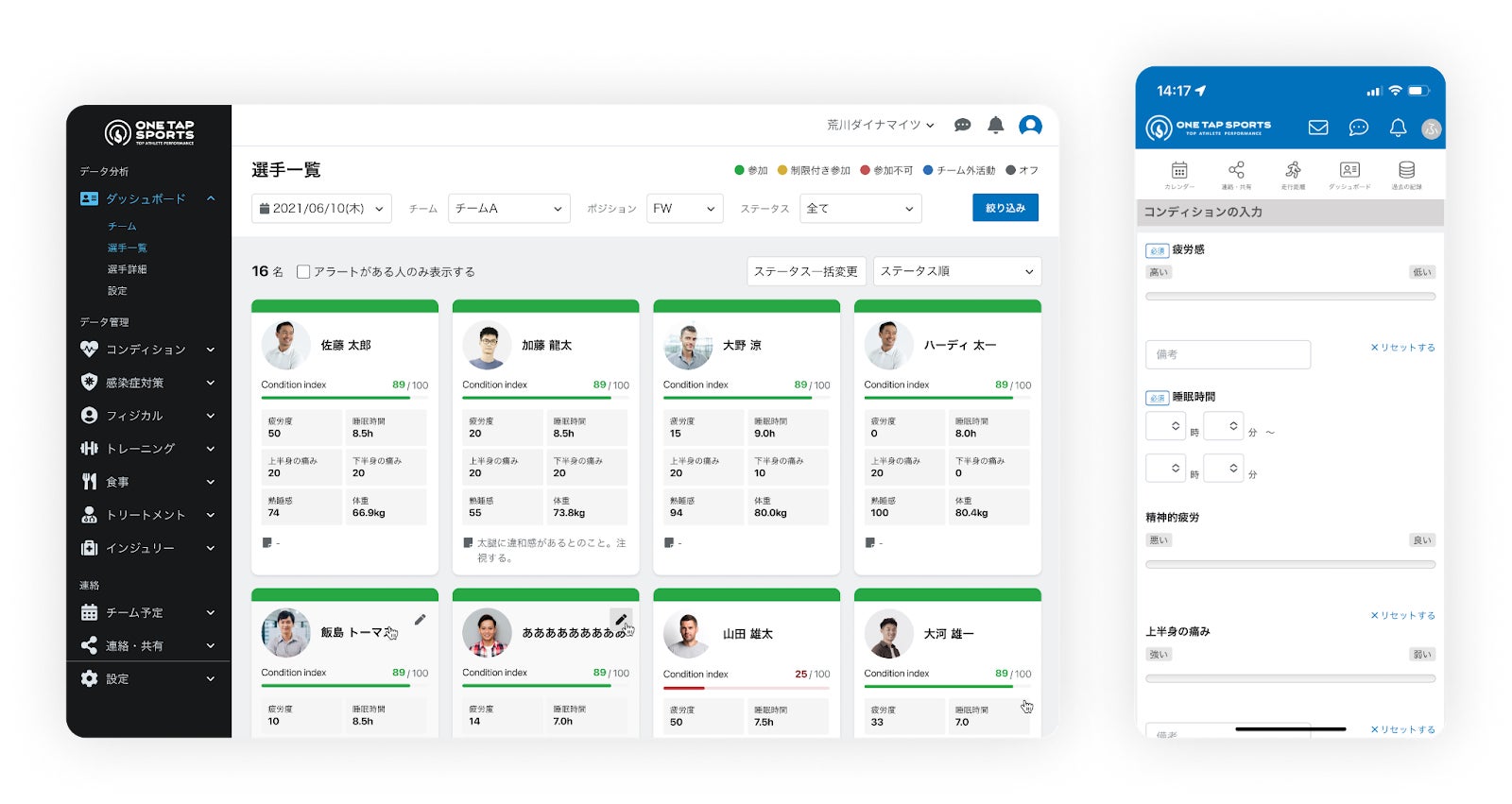 専用アプリ(ONE TAP SPORTS)を利用し、従業員の皆さまの体調、疲労感、睡眠、身体の痛みなどを見える化し、日々モニタリングします。不調を検知し、アラートを発出します。また、不調やコンディション状態に応じたオリジナルのエクササイズ動画もご覧いただくことが可能です。