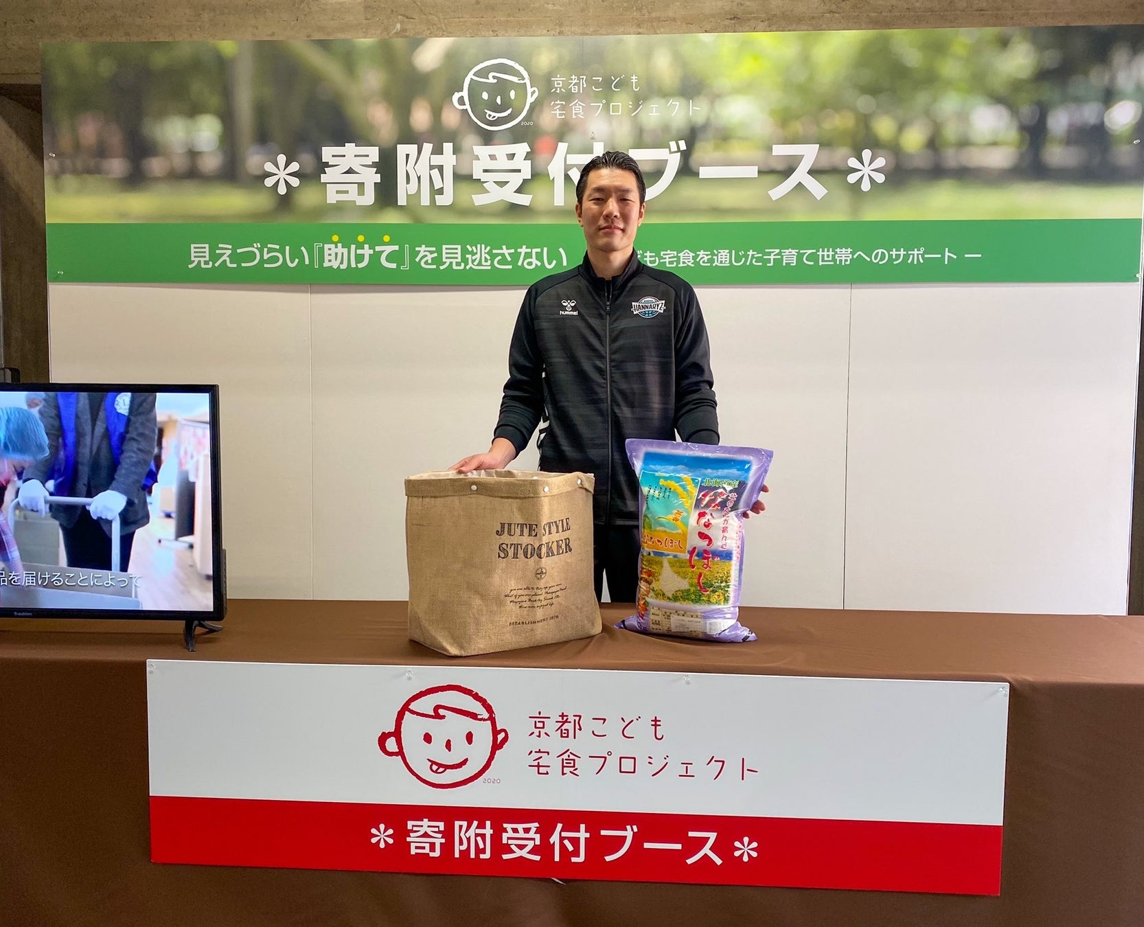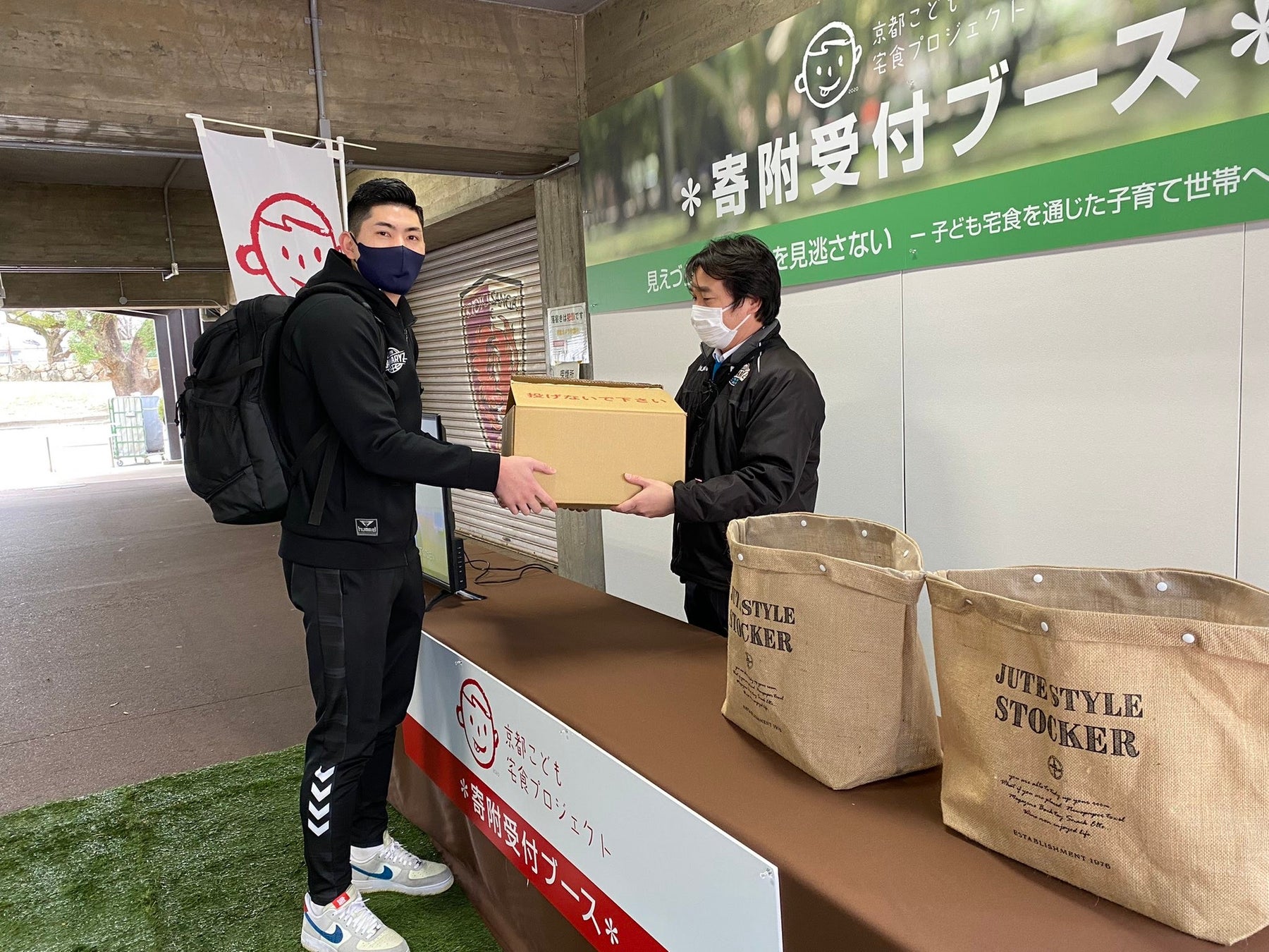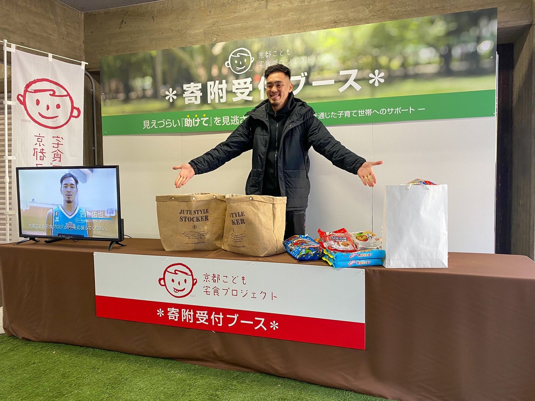 1月29日(土)、30日(日)、京都ハンナリーズのホームゲームが行われる京都市体育館の場外にて、京都こども宅食プロジェクトへの寄附となる食品を募りました。二日合計340点、段ボール箱約10箱の食品を寄附いただきました。