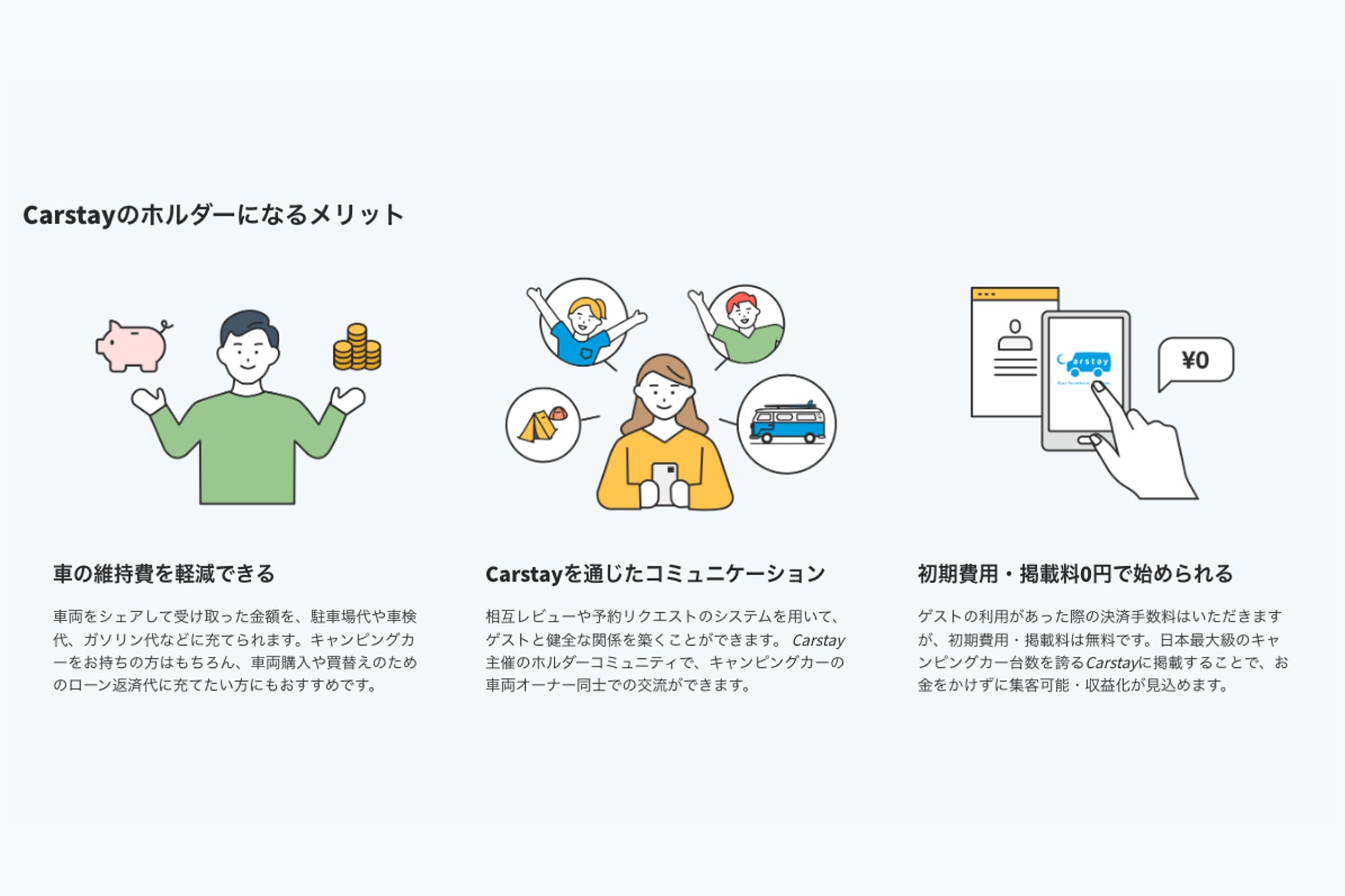 Carstayは2020年6月から日本で初めて、キャンピングカーを含む車中泊仕様のバンに特化した車を、個人間や、法人と個人間で共用することができるカーシェアのプラットフォーム・サービスを開始しました。キャンピングカー保有者は、車両を使っていないときに、車両を使いたい人に有料で共用し、副収入を得ることができます。車両の盗難・詐欺・横領損害、対人や対物、車内装備の破損などのカーシェア専用保険に業界で初めて補償、車両所有者は自身の保険を利用することなく、安心して車両を共用することができます。