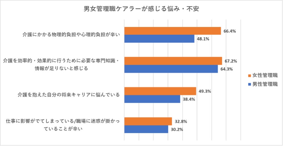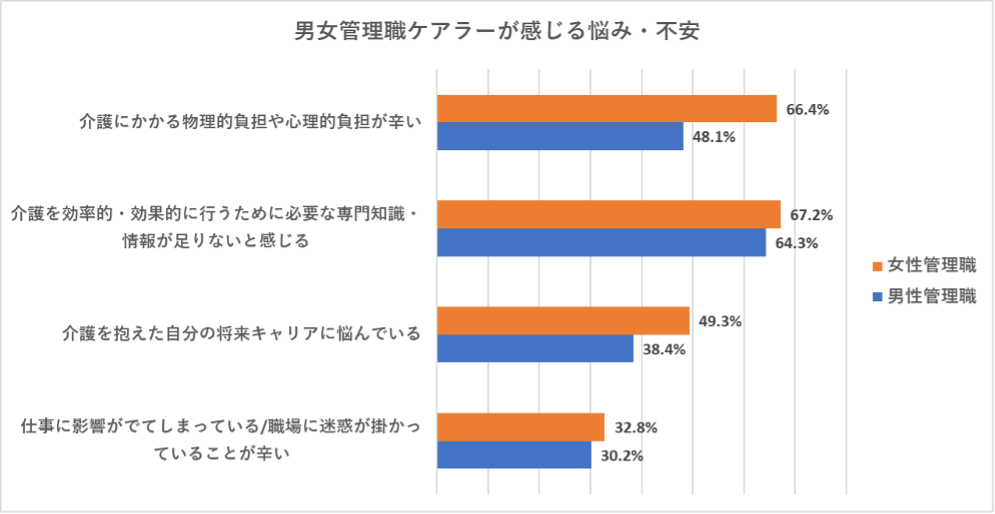 ■7割「辛い」、5割「キャリア継続不安」と女性管理職ケアラーの悩みは男性より深い