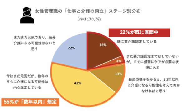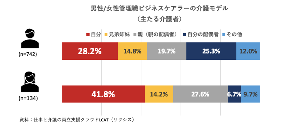 さらに、まだ日々の介護には直面していないものの数年内に要介護家族の世話が必要になるとみている【ビジネスケアラー予備軍管理職】も、いざというときに想定する主たる介護者が「自分」であると答えた割合は、女性管理職が圧倒的に多い(34.2%)結果となっています。