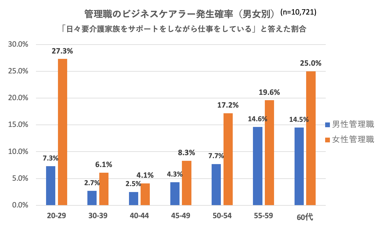 しかし、それらの家族について、「日々要介護家族をサポートしながら仕事をしている」と回答した割合、いわゆるビジネスケアラー発生確率をみると、全年代を通じて、女性管理職の方が男性管理職よりも高い結果となっています。特に管理職層のボリュームゾーンである40-54歳の年代では、女性管理職のビジネスケアラー発生確率は男性管理職の約2倍となっていることが明らかになりました。