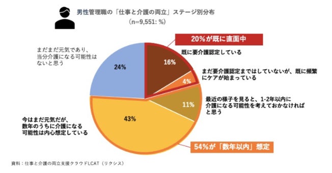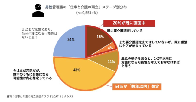 LCAT利用者のうち、管理職10721人のデータをもとに、想定する介護対象者の現在の状態をきいたところ、すでに介護問題に直面している割合(※1)は、女性管理職で22%、男性管理職で20%とほぼ同水準でした。