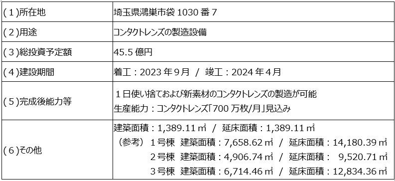 当社は、国内外でのコンタクトレンズの需要拡大への対応として、安定した商品供給と今後の成長戦略を実現するため製造設備の増設を進めております。今回新設した2号棟別館への製造設備導入後の本格稼働によりシード鴻巣研究所のコンタクトレンズ生産能力は「約6,500万枚/月」となる見込みです。