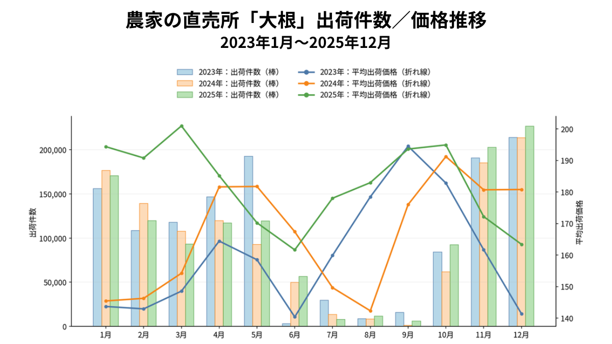 出荷のピーク期は12月(226,235件)・11月(202,413件)・1月(170,492件)に集中しており、大根の秋冬需要の高さが反映されています。