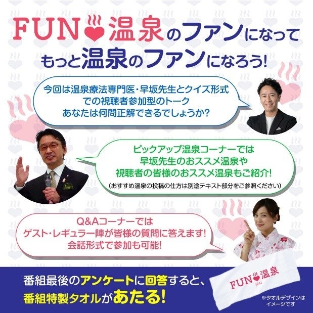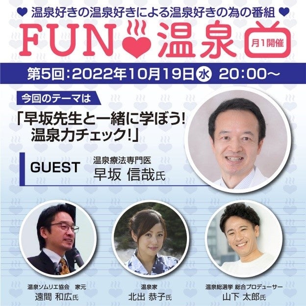 【参加無料】温泉好きによる温泉好きのための番組“FUN温泉”第5回 「早坂先生と一緒に学ぼう!温泉力チェック!」10/19(水)20:00~配信!