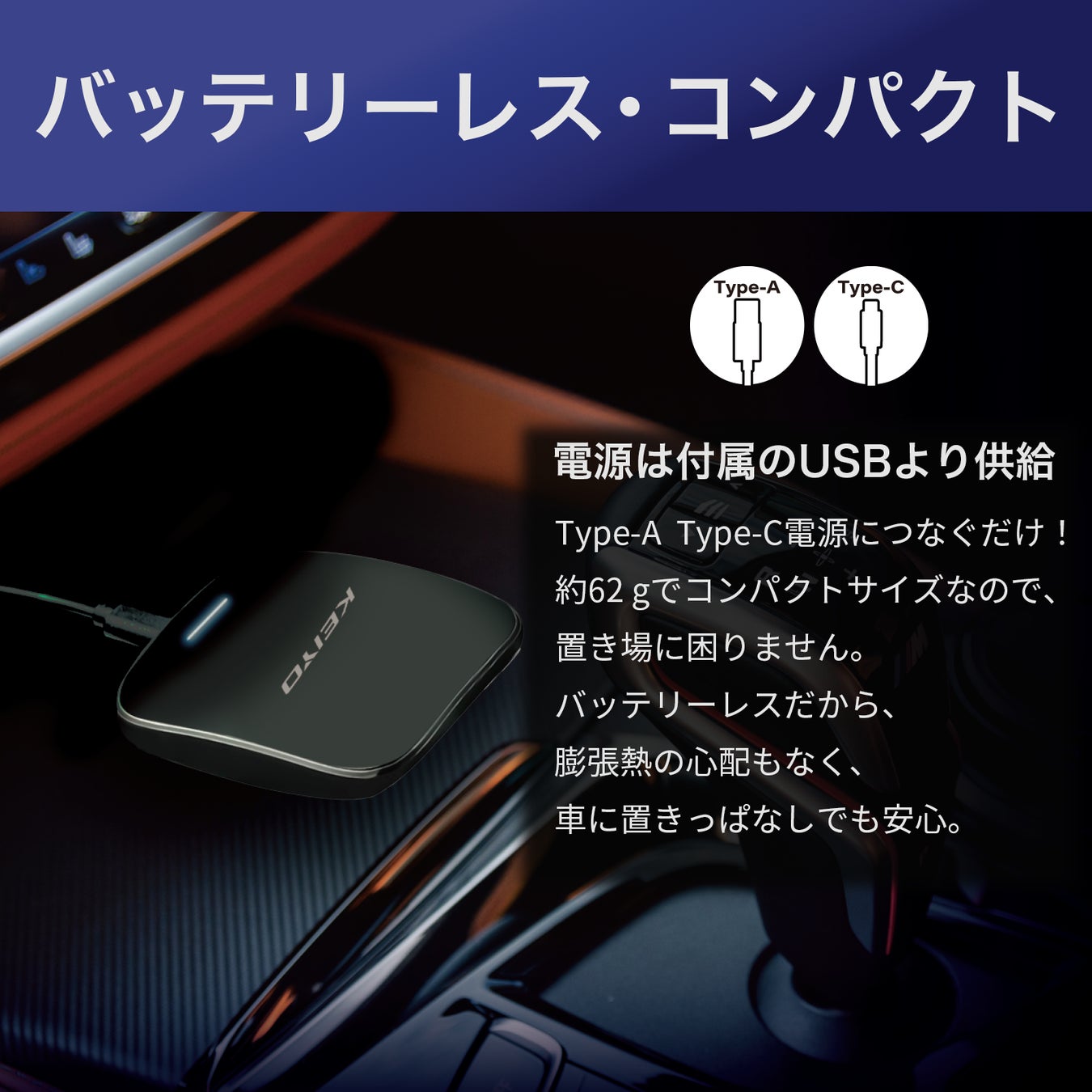 電源は車両のUSB(Type-Aまたは、Type-C)より供給、重量は約62gでコンパクトサイズなので、置き場所に困りません。