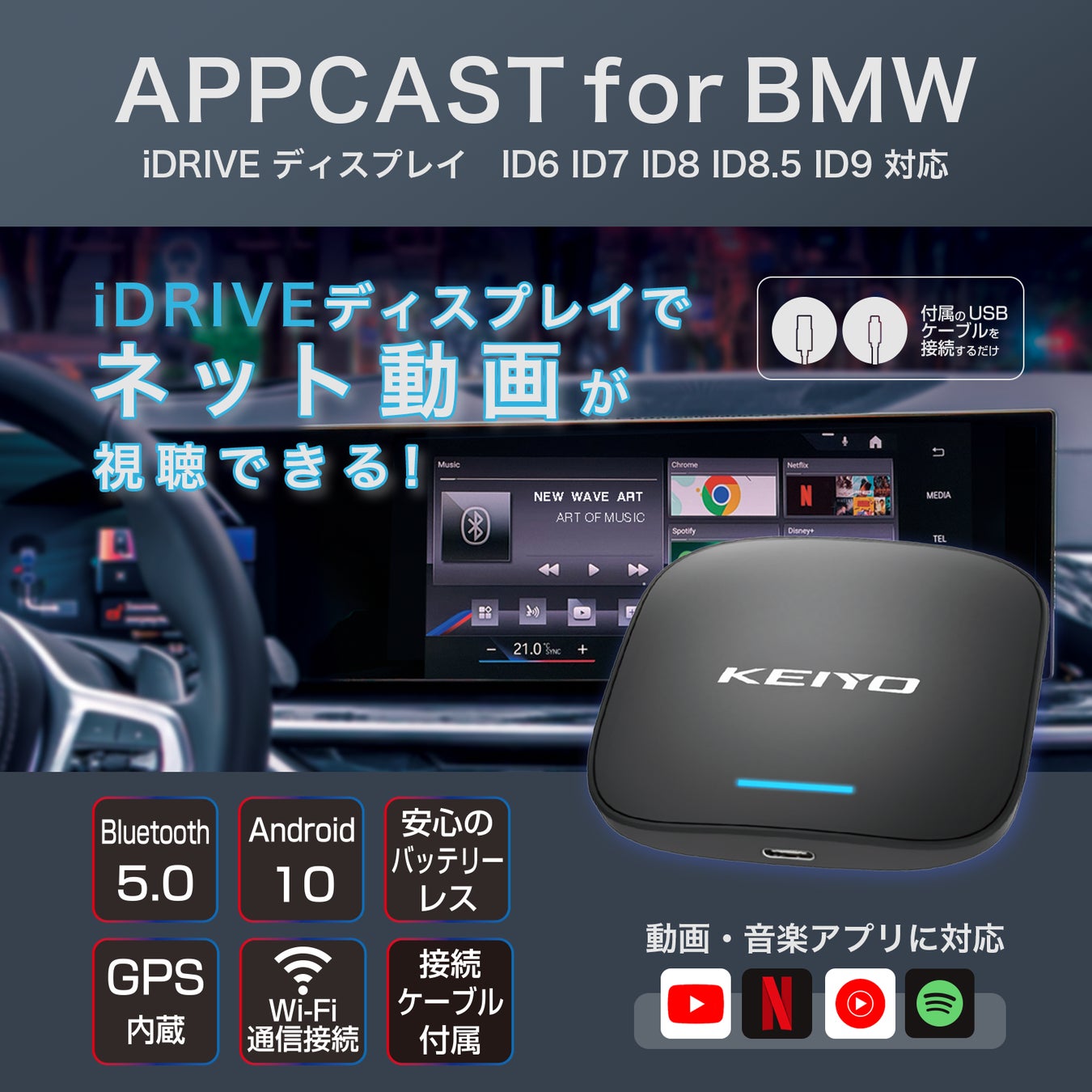 KEIYO APPシリーズに新商品BMWの無線接続Car Playに接続して、動画配信サービスなどさまざまなAndroidアプリが楽しめる「APPCAST FOR BMW」6月22日(土)発売