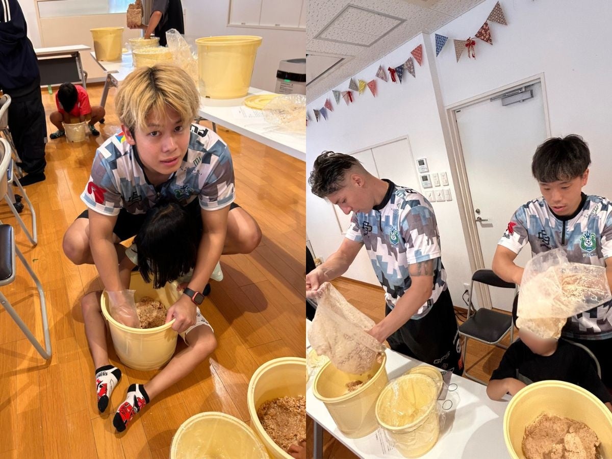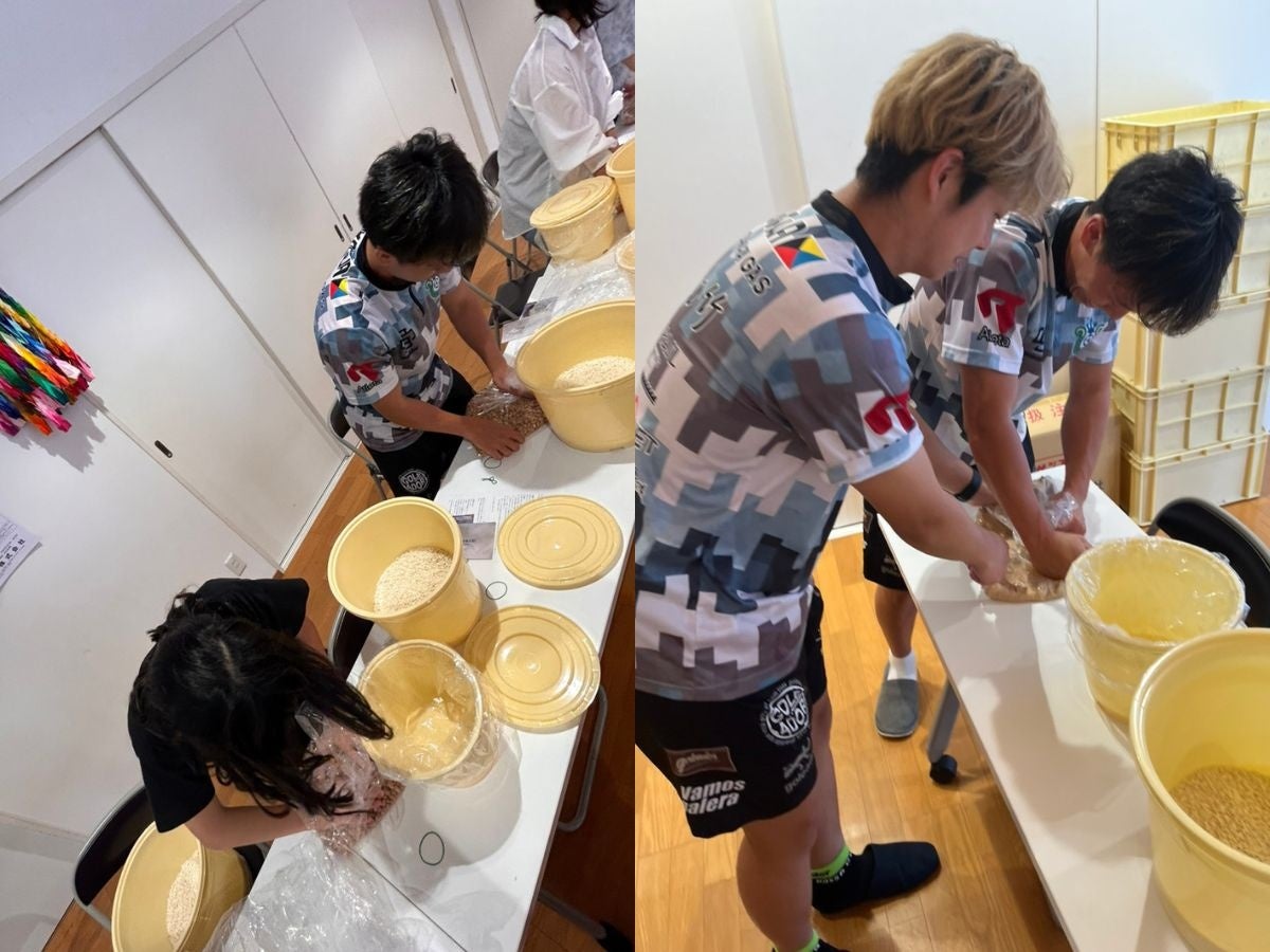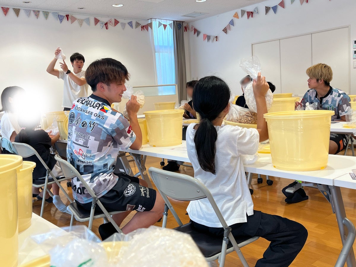 用意された材料を混ぜ合わせたり、大豆をつぶしたり、選手と子どもたちは、コミュニケーションを取りながら味噌づくりを進めて行きます。