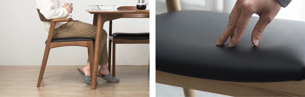 本製品は肘掛け自体が短い「ハーフアーム」にすることで、フルアーム同様に腕の重さを預けておくことができるうえに、膝から太もも周辺に動きを遮るフレームがないため着座の際の座り方の自由度が高くなっております。リラックスするときは肘をかけてゆったり寛ぐことができ、立ち座りする際は邪魔にならない、“寛ぎ”と“利便性”を兼ねそろえたチェアになっています。