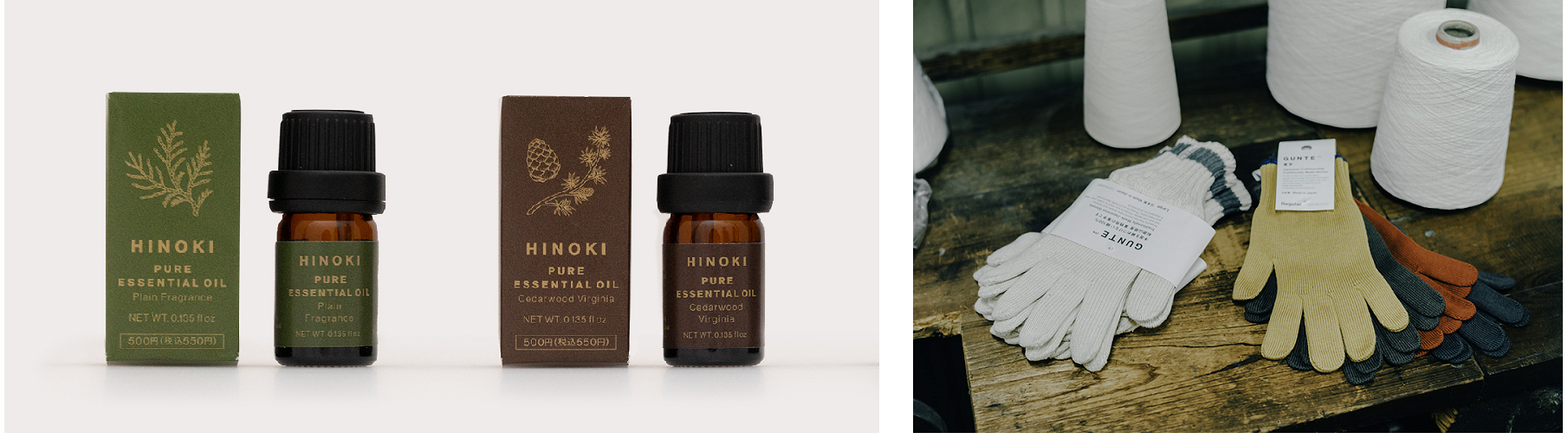 左: ヒノキピュアエッセンシャルオイル高知県の「四万十ヒノキ」を使用した天然成分100%の精油