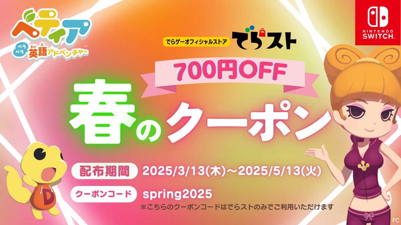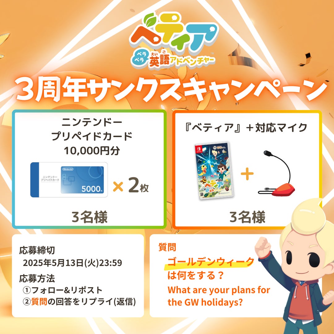 株式会社でらゲー(代表取締役:家次栄一)は、遊びながら自然に英語が学べるNintendo Switch™向け体験型英語学習ソフト『ベティア ペラペラ英語アドベンチャー』について、発売3周年を記念して、「ベティア」本編のゲームソフトやニンテンドープリペイドカードなど豪華賞品が抽選で6名様に当たる「ベティア 3周年サンクスキャンペーン」を開催いたします。