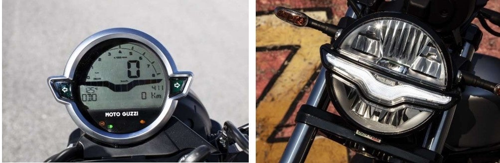 V9 Bobber は LCD ダッシュボードを搭載し、イーグルの姿を連想させるフルデジタル式の丸形シングルダイア ルを採用。LED のヘッドライトにもマンデーロイーグルの形をした DRL を備え、一目でモト・グッツィであることを 認識させます。また、バイクをスマートフォンに接続し、様々な情報メニュー(スピードメーター、タコメーター、瞬 間出力、瞬間トルク、瞬間または平均燃費、平均速度、バッテリー電圧、制御の状態、縦加速度、トリップコンピ ューターなどを含む)から選択可能な 7 つのパラメーターをスマートフォンの画面上で同時に確認することがで きる Moto Guzzi MIA マルチメディアシステムをオプションで装着する事が可能で、さらに Bluetooth を介して音 声コマンドの利用や着信・発信の管理、音楽プレイリストの管理が可能になり、また電話音声アシスタントの操 作を含め、ハンドルバーの便利なコマンド機能で、すべてのインタラクションを管理することが可能になります。