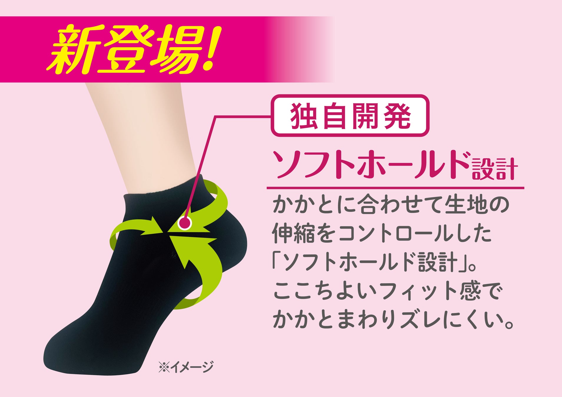 この春登場したショート丈は、かかと部分に独自開発“ソフトホールド設計”を採用。かかとに沿って生地がやさしく伸縮するので脱げないのに締め付けを感じにくいこだわりの設計です。