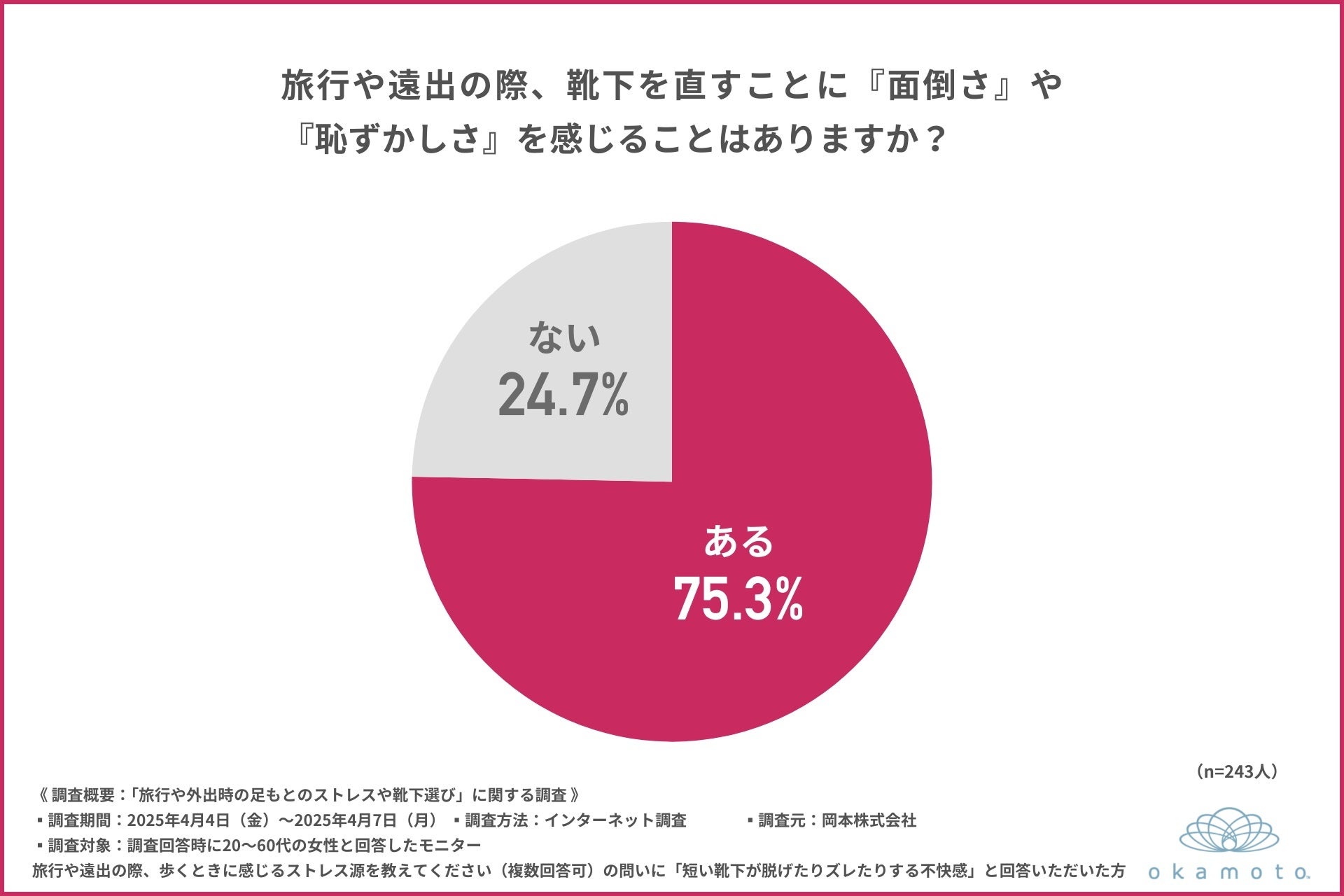 外出中に脱げた靴下を直すことを面倒に感じている人は75%も