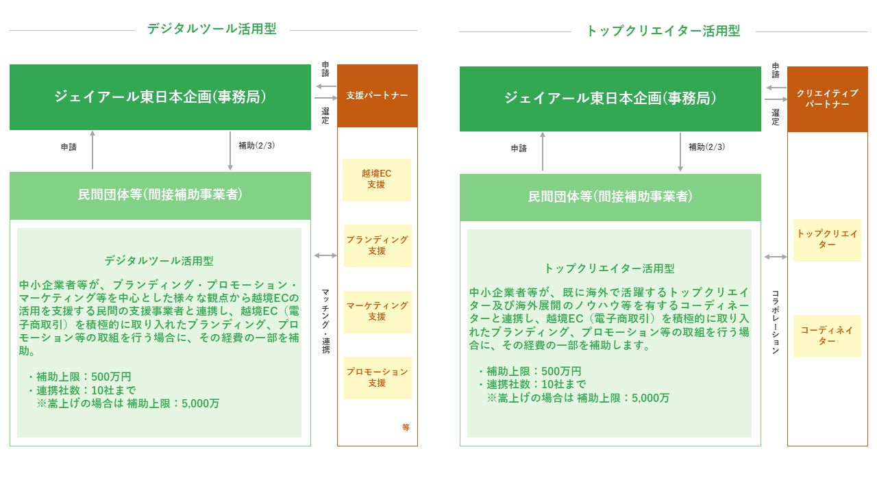 効果的に海外からの需要獲得に繋げるために、越境ECの活用に関するノウハウや経験を有する民間の支援事業者や、突き抜けた創造力を有し海外で活躍するトップクリエイターとの連携が必要となります。そのため、本事業においては、前者を「支援パートナー」(デジタルツール活用型)、後者を「クリエイティブパートナー」(トップクリエイター活用型)と選定し、本事業に申請する中小企業者等は、選定された支援パートナー(もしくはクリエイティブパートナー)のうち最低1社以上から事業支援を受けることを必須とし、本事業に取り組むことを要件としています。