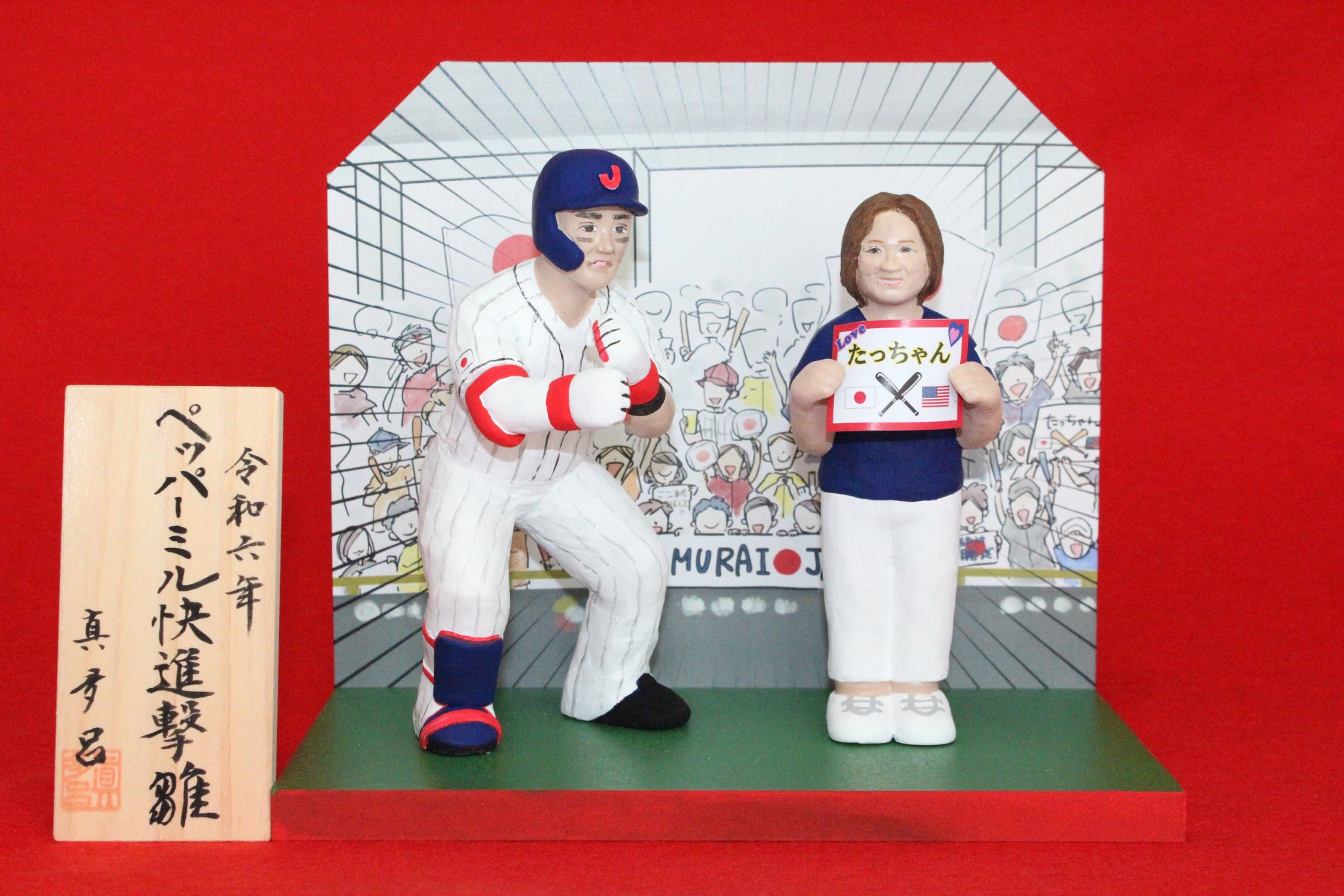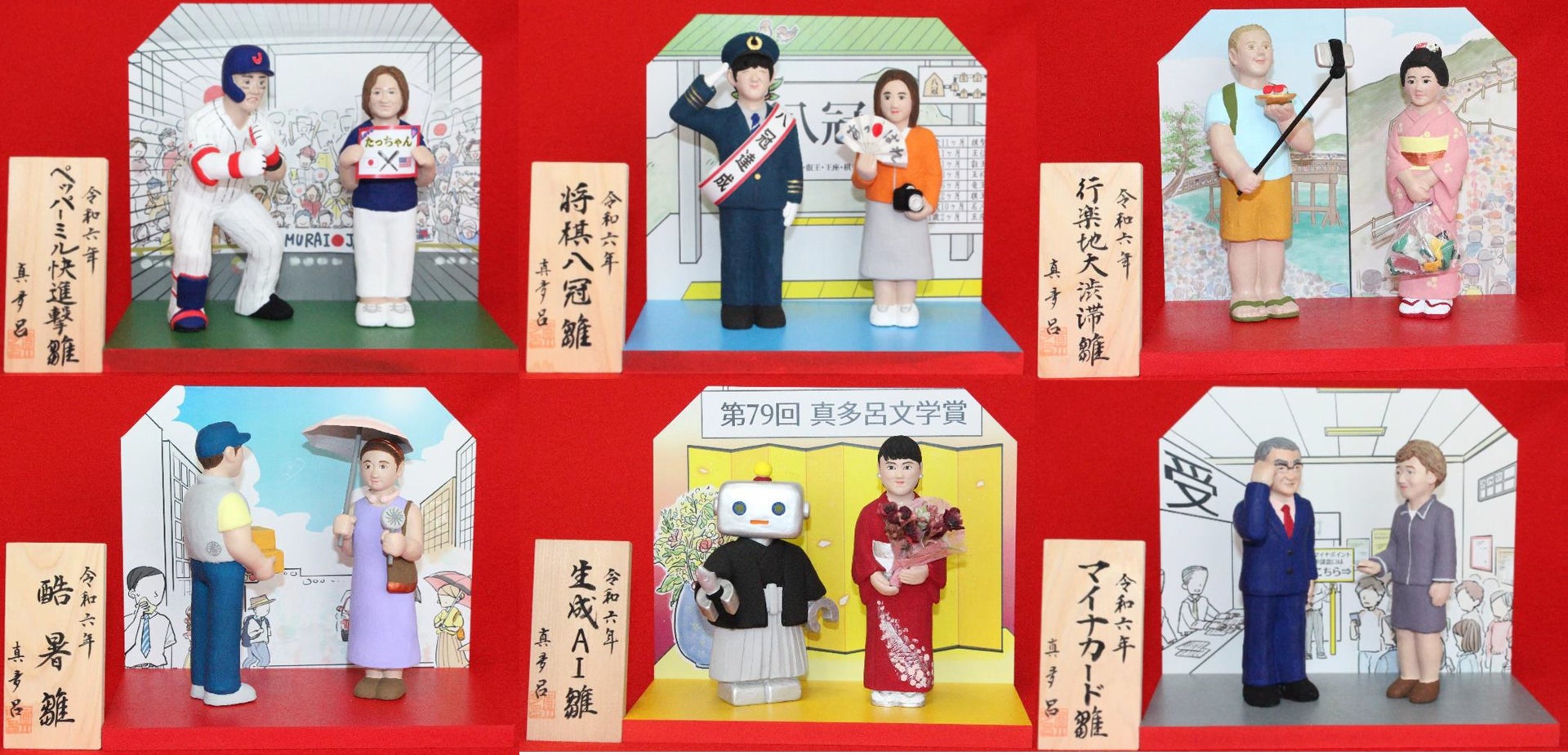 世の中に活気が戻ってきた2023 年。株価はバブル後の最高値を更新し、海外から観光客が押し寄せインバウンド景気も復活。侍ジャパンのWBC 優勝や阪神タイガースの日本一など、スポーツ界も大いに盛り上がりました。そのような世相を反映した6体の真多呂変わり雛を展示いたします。