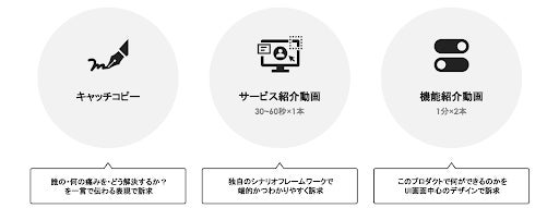 差別化が難しいSaaSプロダクトの魅力が伝わる「キャッチコピー」に加えて、「サービス紹介動画1本」「機能紹介動画2本」の動画制作をパッケージ化