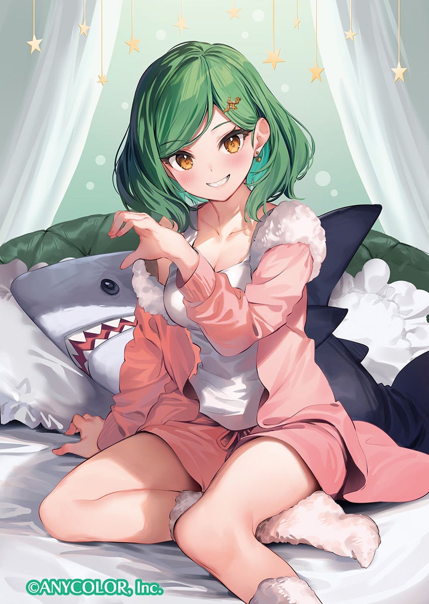 イラストレーター パセリ(Parsley)さんに、タイクレ限定プライズ用としてルームウェア姿の「北小路ヒスイ」を描き下ろしていただきました。チャームポイントのギザ歯が可愛い「北小路ヒスイ」の背景には、好きな動物の「サメ」をモチーフにしたクッションが描かれています。