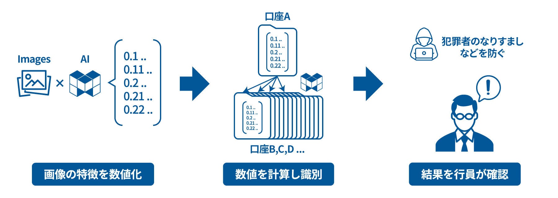 そこで、みんなの銀行とグルーヴノーツは、AIを活用した不正口座のモニタリングに着手し、この本格運用が開始されました。今回適用した技術は、グルーヴノーツの「MAGELLAN BLOCKS」で提供する、深層学習で画像の特徴を学習・分類する画像解析技術です。取引開始直後の口座保有者に対して他に口座登録がないか、オンライン本人確認(eKYC)時の画像から抽出した特徴をもとに識別が行われ、同一人物と思われる口座の候補が抽出されます。