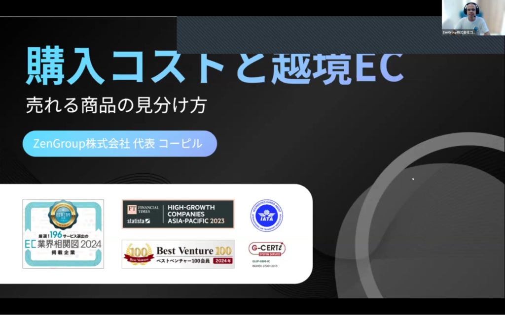 希少性が高く購入コストが低い商品、ハイブランドのリユース品などの商材や配送料について、後半では「越境ECの配送コストを下げるためにZen groupの提供する配送サービスを活用して欲しい」とウェビナー参加者へ向けて述べられました。