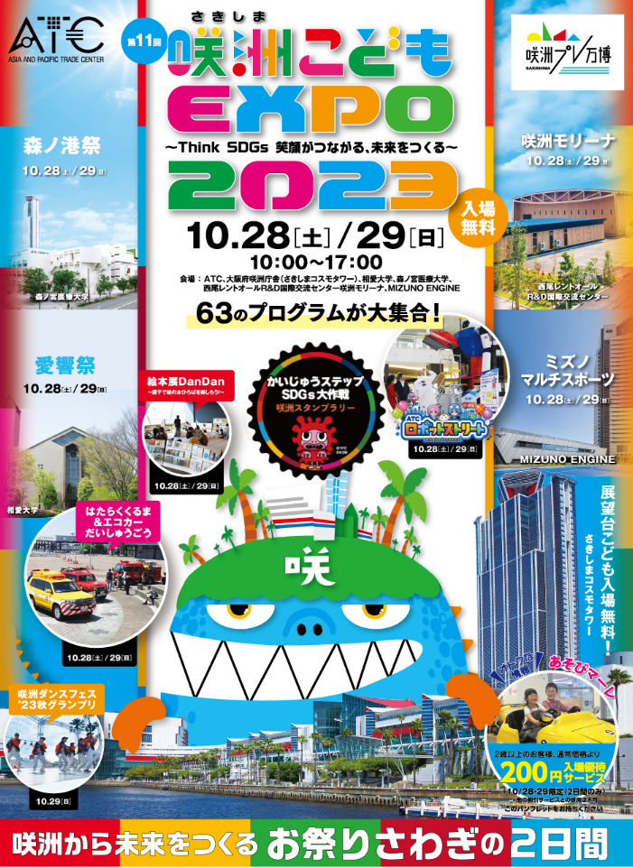 令和5年10月28日(土曜日)及び10月29日(日曜日)の2日間、咲洲(南港)地区にあるATC(アジア太平洋トレードセンター)、大阪府咲洲庁舎(さきしまコスモタワー)等を主な会場として、「第11回 咲洲こどもEXPO 2023 ~Think SDGs 笑顔がつながる、未来をつくる ~」が開催されます。