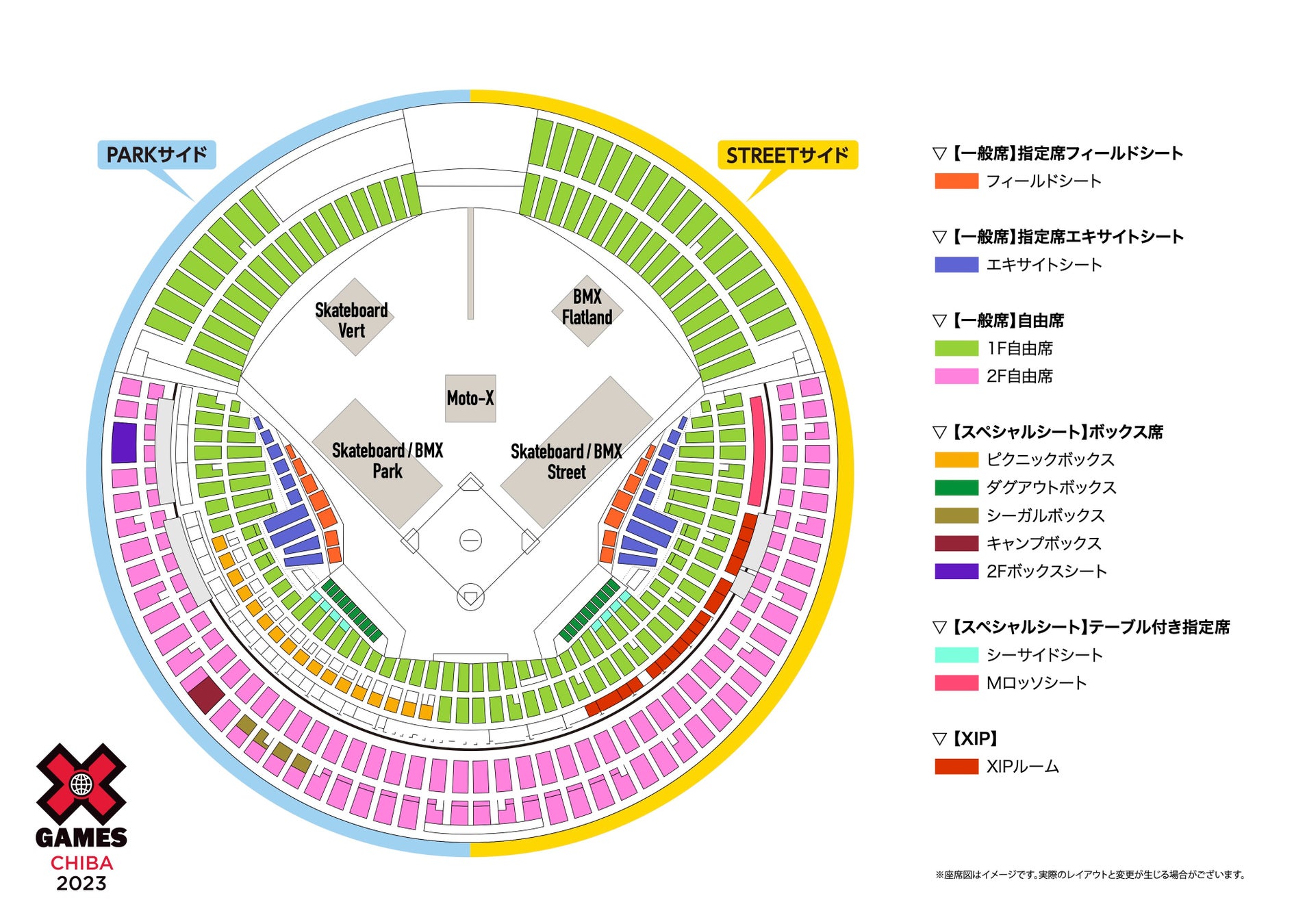 「X Games Chiba 2023」はスタジアムのグラウンド内にStreet(ストリート)、Park(パーク)、Vert(バート)、Flatland(フラットランド)、Moto-X(モトエックス)の5つの競技ステージを設置し、観客席はグラウンドを取り囲むように配置しています。
