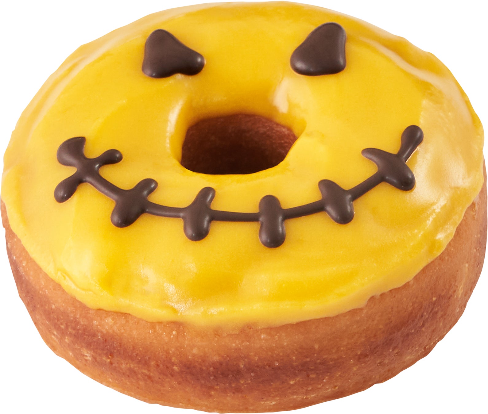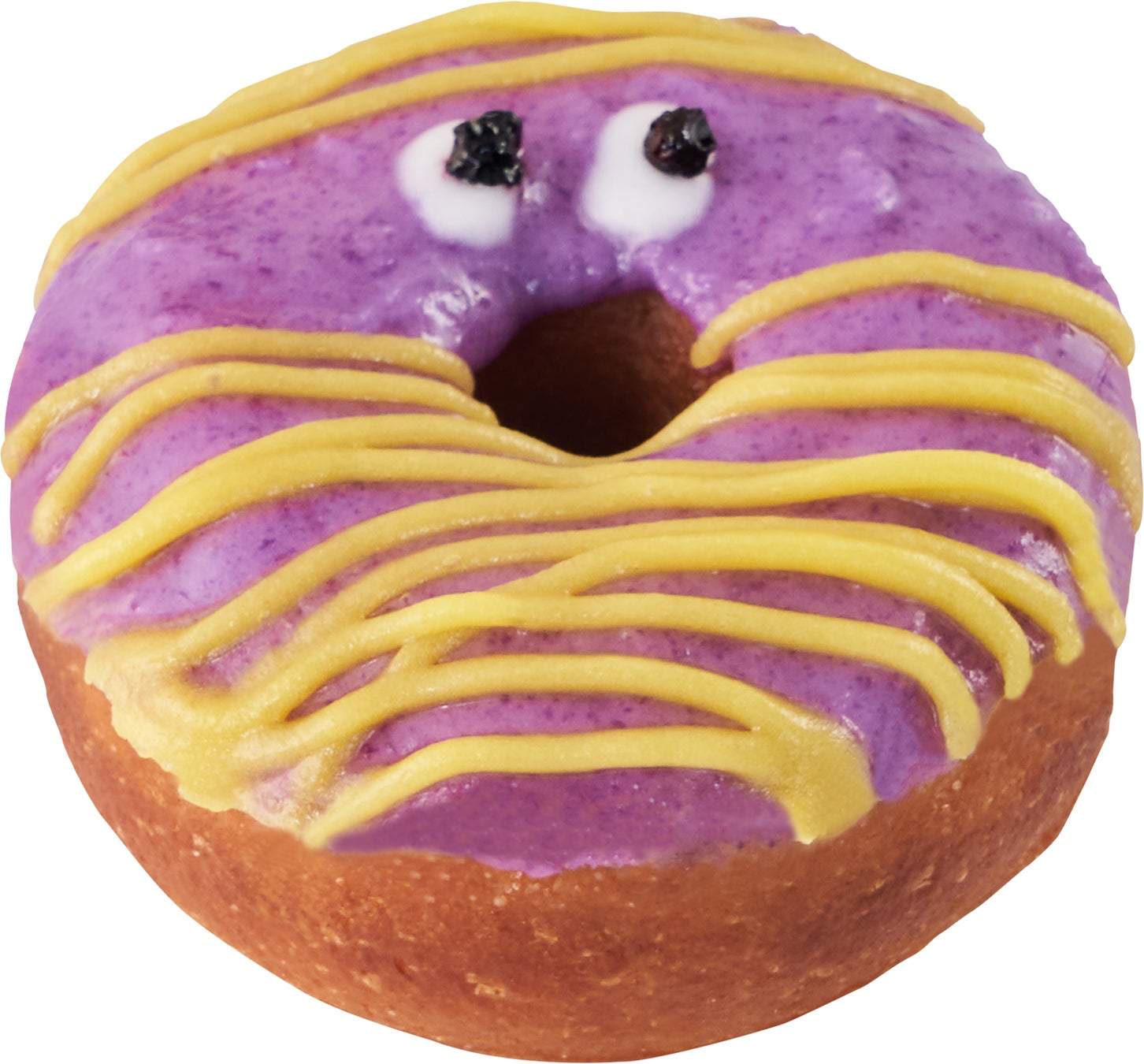ハロウィンのマミーをイメージした紫と黄色のポップなデザインで、見ても食べても楽しめるドーナツに仕上げました。