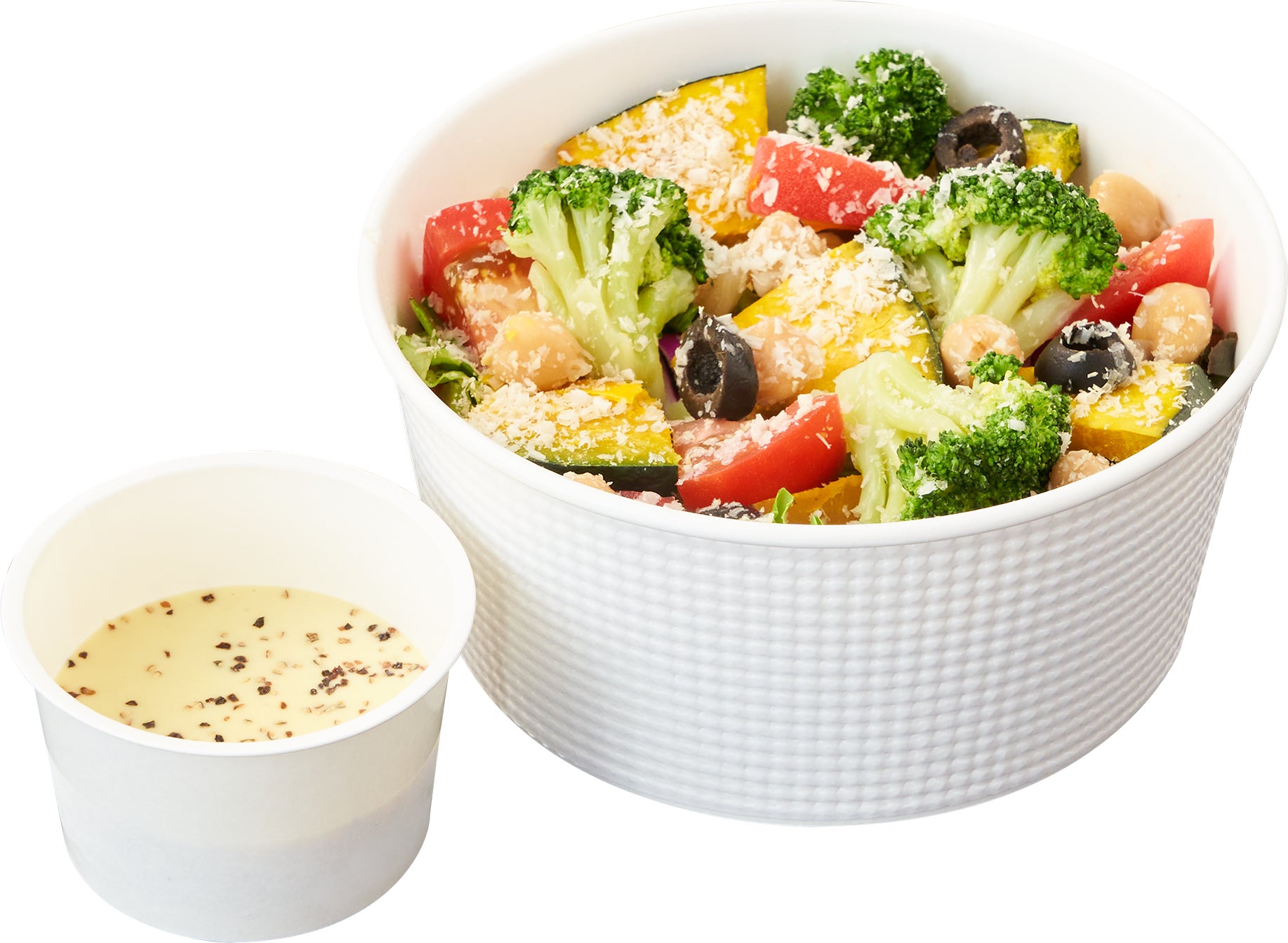 トマト、カボチャ、ブロッコリーなどの具材で鮮やかな色合いや食感の違いも楽しめます。サラダの上には粉チーズの代わりにカシューナッツを振りかけて見た目のアクセントに。1日に必要な1/2の野菜量※が摂れる、普段の食生活で野菜が足りていないと感じる方におすすめしたい具沢山サラダです。
