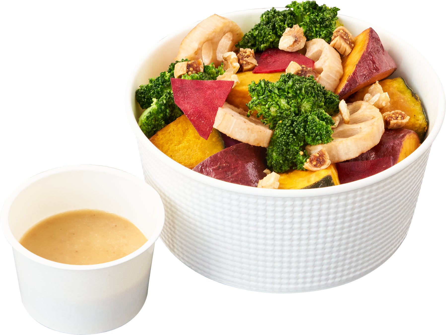 大学芋風で大人の甘さを楽しめるさつまいもや、素揚げで旨味を凝縮したレンコン、かぼちゃで秋の味覚を楽しめます。ビーツの色味で秋らしさを演出し、食感のアクセントにくるみを加えました。ナッツが香るマイルドな特製ごまドレッシングが秋野菜のホクホク感にマッチした、特別感のあるサラダです。