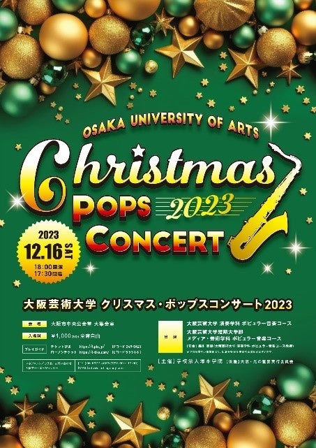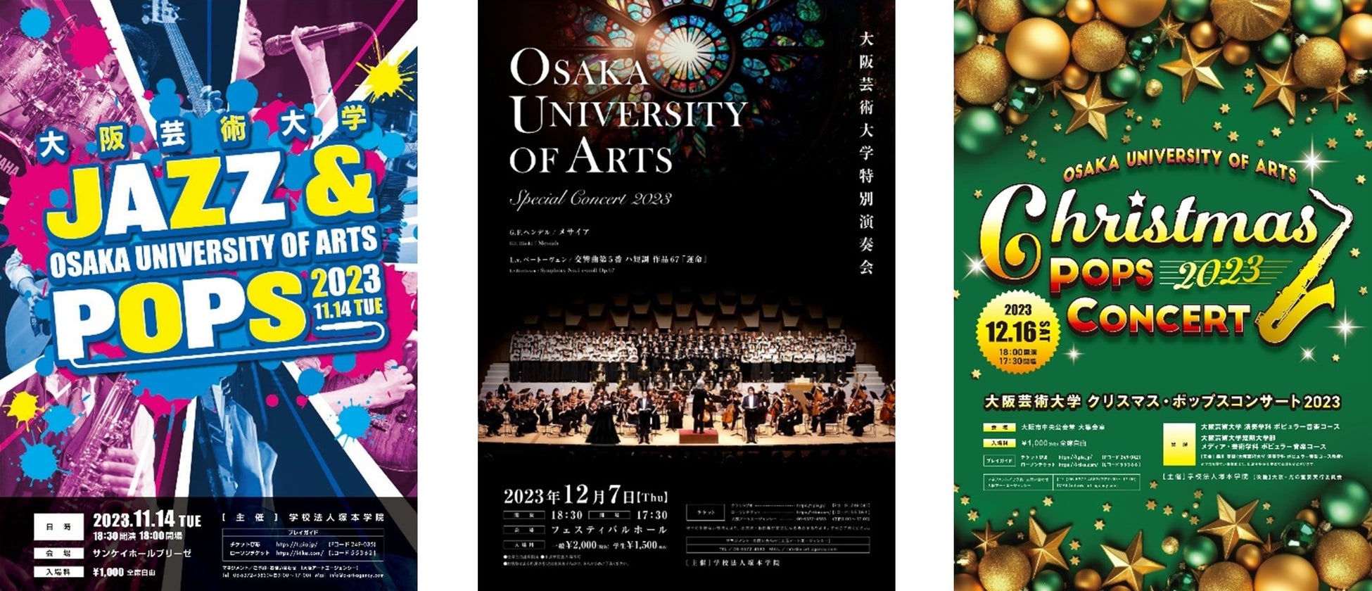 大阪芸術大学(学校法人塚本学院/所在地:大阪府南河内郡/学長:塚本 邦彦)は、2023年11月14日(火)に「大阪芸術大学 JAZZ&POPS 2023」、12月7日(木)に「大阪芸術大学 特別演奏会 2023」、12月16日(土)に「クリスマス・ポップスコンサート2023」を開催いたします。
