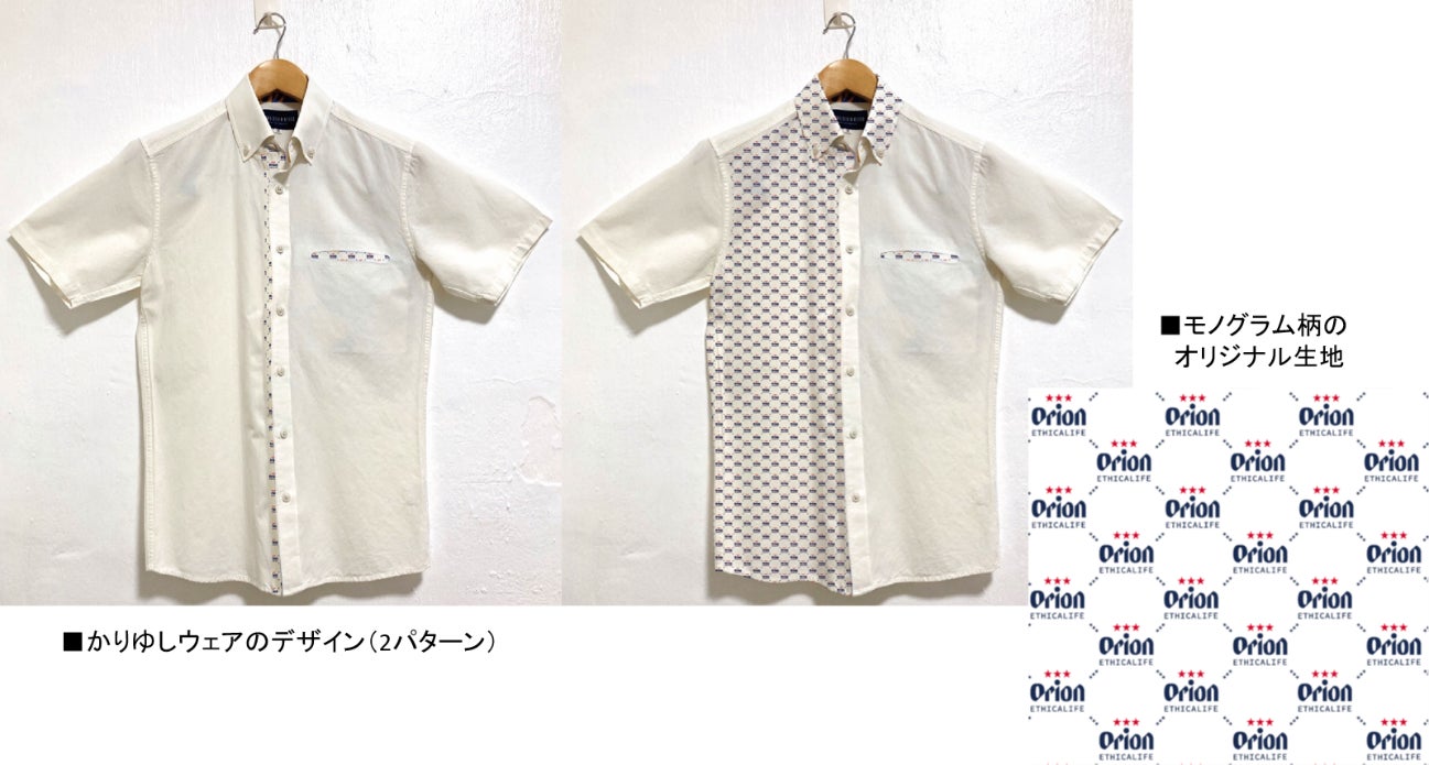 また、同じくバガスから生まれた生地で作った「かりゆしウェア」も登場します。オリオンビールのロゴマークをモノグラム調に配置したシンプルなデザインは、沖縄のリゾートウェアとしての使用はもちろん、夏場の日常利用にもぴったりな一着。沖縄の縫製工場にて一つひとつ仕立てます。