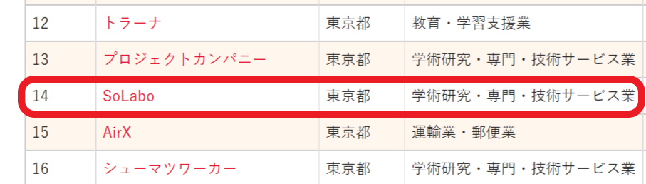 なお、今回の調査を実施したスタティスタは、イギリスのFinancial Timesとの共同調査としてアジア大洋州地域の成長企業上位500社も公表しており(FT ranking of 500 of the Asia-Pacific region’s high-growth companies)、SoLaboは当該調査においては、「Management Consulting(マネジメント・コンサルティング)部門」において海外企業を含めて全体3位、アジア太平洋地域総合では102位に選出されました。