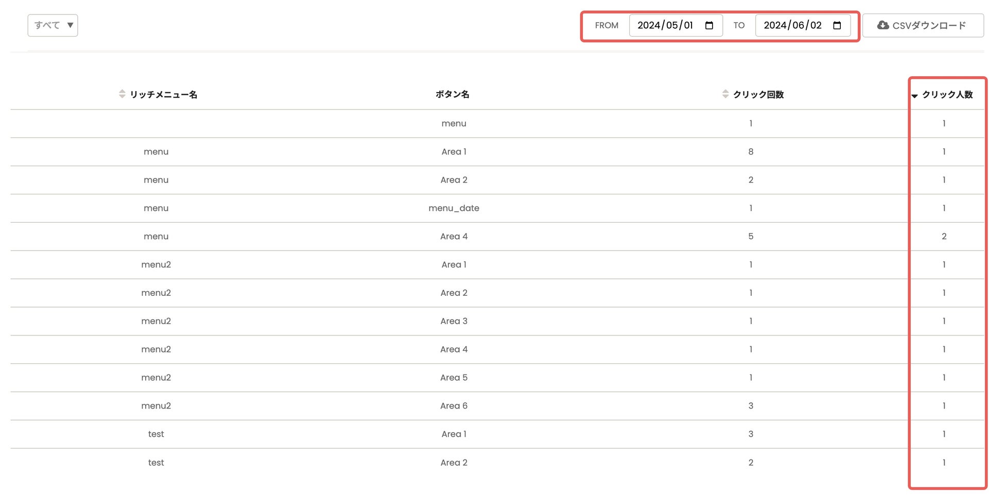 リッチメニュー名、ボタン名、クリック数、ユニークユーザー数のデータを期間を指定して確認できます。