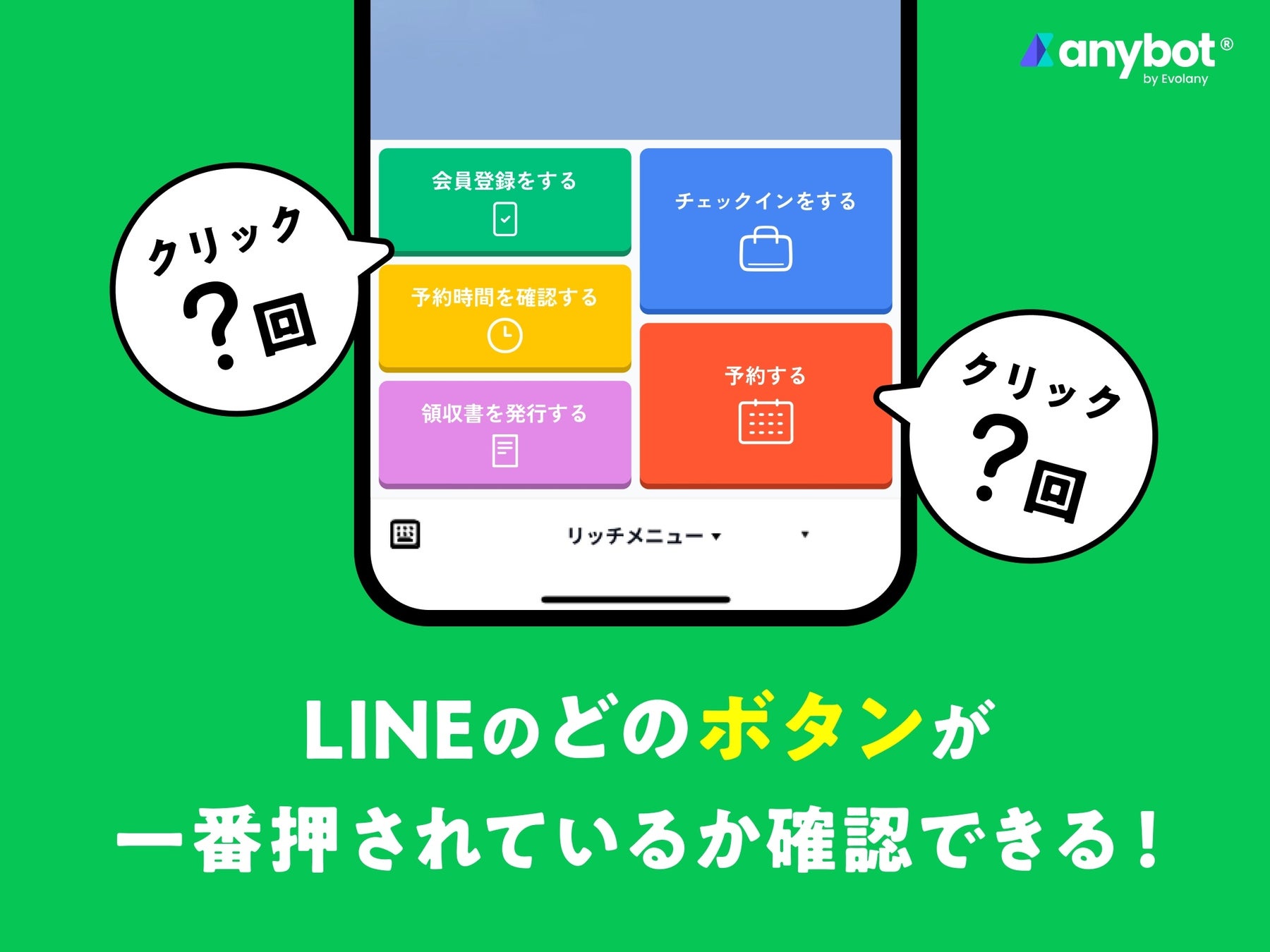 エボラニ株式会社が提供するLINEマーケティングツール「anybot」でも、LINE公式アカウントのトークルームに固定表示するリッチメニューのクリック数やユニークユーザー数を管理画面で確認できるよう機能を改善しました。利用状況を元に、リッチメニューを変えたりボタンの位置を変更したりして運用を改善するのに役立てていただけます。ブランドカラーや特別なキャンペーンをリッチメニューに取り入れ、競合他社と差別化しましょう。