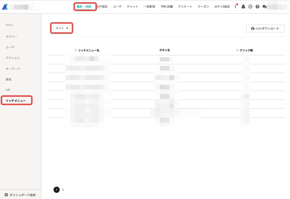 これらのボタンを設定後、管理画面からそれぞれどれくらいクリックされているかを確認できます。CSV形式でダウンロードした数値を分析にご活用いただけます。