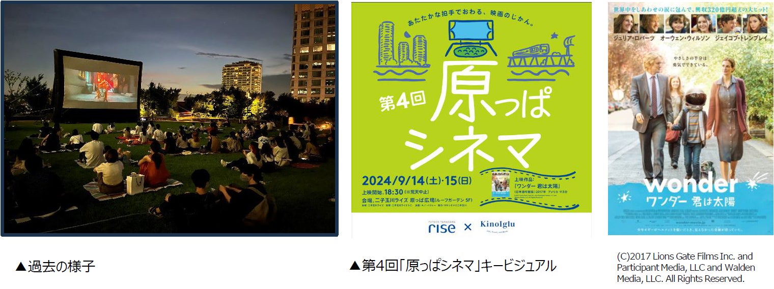 東急田園都市線・大井町線 二子玉川駅直結の大規模複合用途施設「二子玉川ライズ」は、屋上庭園にある芝生の上で特別な映画体験を楽しめる屋外映画館「原っぱシネマ」を、2024年9月14日(土)、15日(日)の2日間、ルーフガーデン 5F 原っぱ広場にて開催します。今年は、秋の訪れを感じ始める9月に初めて開催。ゆるやかな心の変化を描いた感動作『ワンダー 君は太陽』を上映します。心地よい夜風を感じながら、開放的な会場で、 「正しいより、優しいほうを。」という本作の素敵なメッセージを共有し合える時間をお楽しみください。