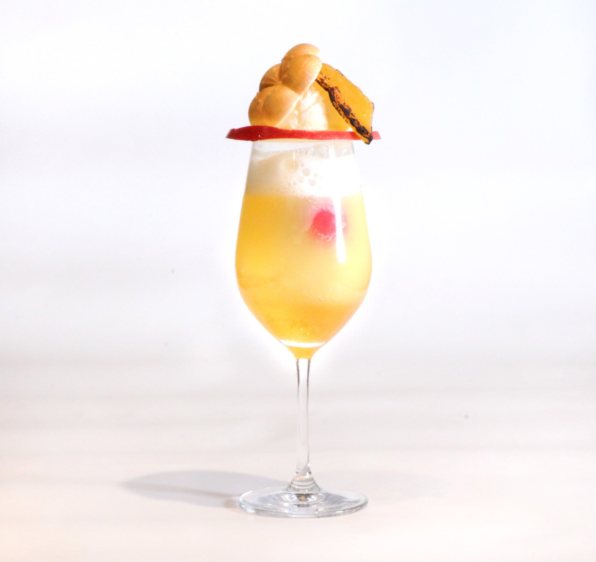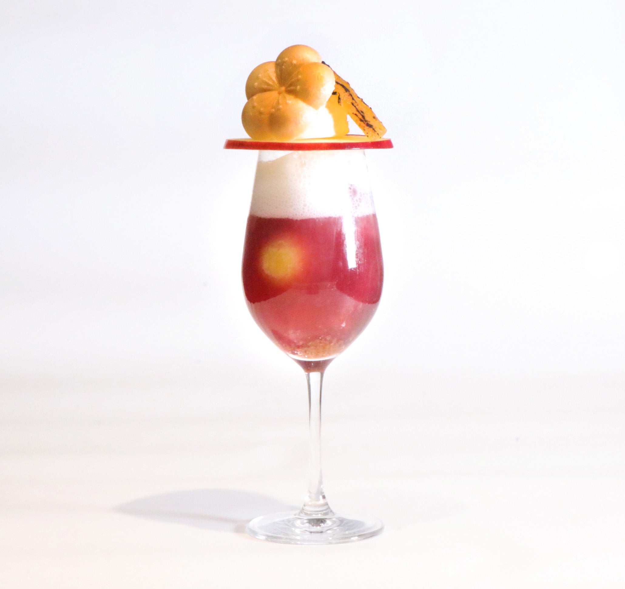 「The CHOYA 夜月」は深い夜の中に輝く月光を、「The CHOYA Ohichou」はイチョウ並木から陽光が射す光景をイメージしました。モコモコした白い雲は、梅とヨーグルトと乳酸菌飲料を使った白いエスプーマで表現。ともに本格梅酒The CHOYAと至極の梅シロップにフローズン完熟南高梅を1粒使用し、しっかりとした濃厚な味わいをお楽しみいただけます。夜空は梅と葡萄、イチョウ並木は梅とミカンで表現し、スライスした焼きリンゴでグラスに蓋をし、バニラアイスの上に梅蜜をコーティングしブリュレした干し芋と梅最中をトッピングしました。どちらもアルコールありの酔うタイプとノンアルコールの酔わないタイプからお選びいただけます。