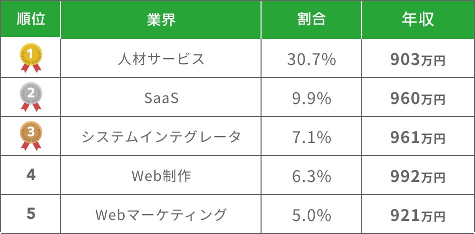 フリーランス・副業のバックエンドエンジニア案件数は、人材サービス業界が一番多い結果となりました。また上位にランクインした業界のうち1位以外は、全体の平均年収905万円よりも高い結果となりました。