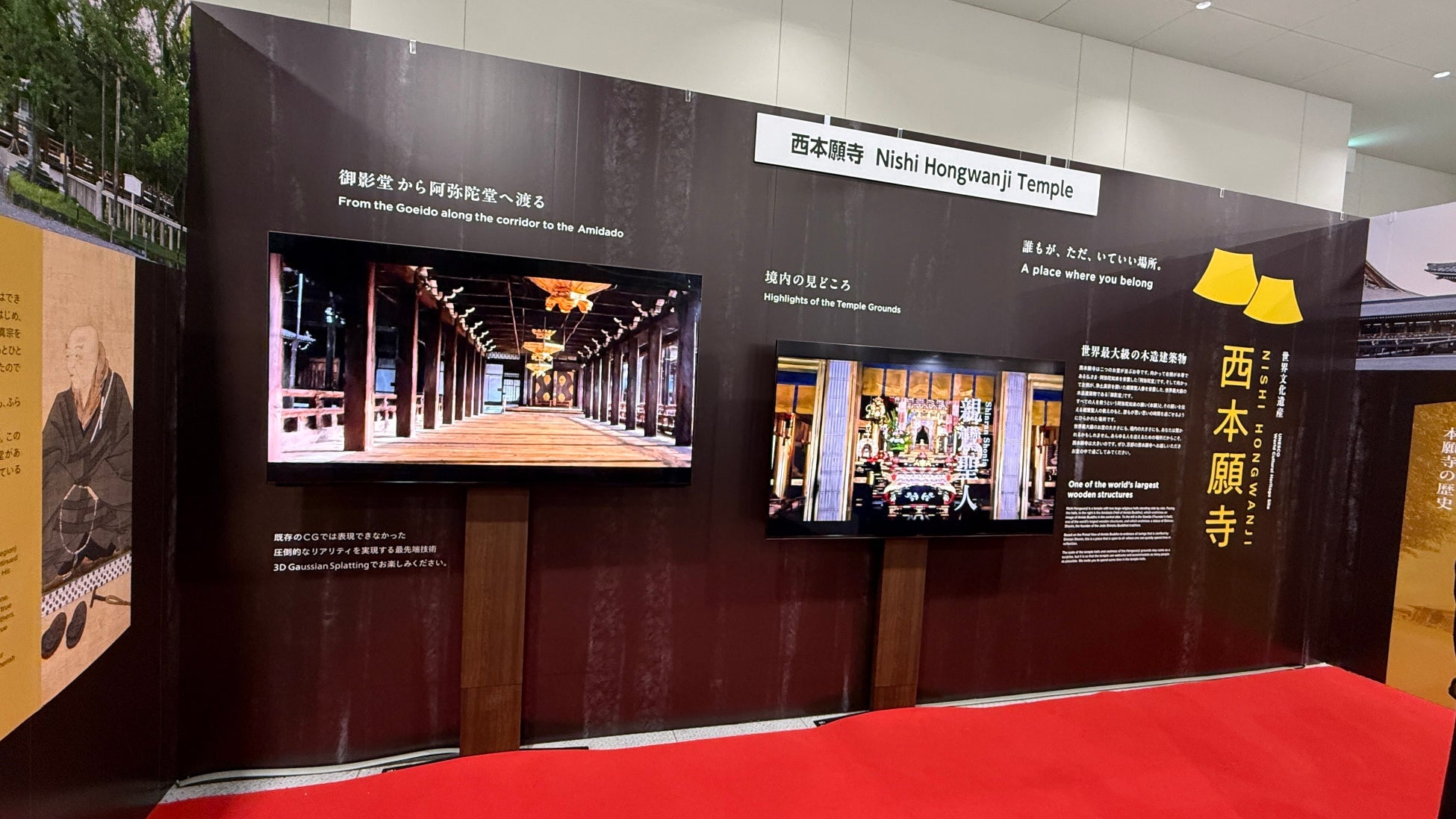 本動画は、先進の「3D Gaussian Splatting」技術を活用し、西本願寺を高精度に3Dデータ化。さらに独自の演出を加えることで、歴史的建造物の持つ荘厳な美しさと空気感をダイナミックに表現した映像作品に仕上げました。伝統と革新が交差するこの映像は、西本願寺ブースにて上映され、来場者に新たな文化体験を提供します。