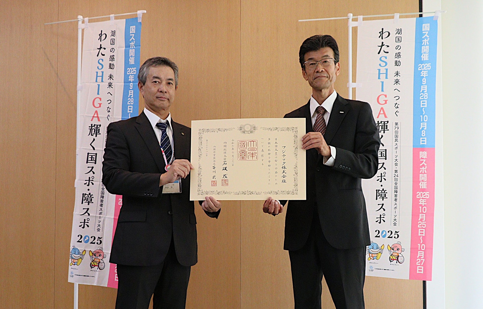 フジテック株式会社(本社:滋賀県彦根市、社長:原田政佳)は、来る9月28日より開催される「わたSHIGA輝く国スポ・障スポ(第79回国民スポーツ大会・第24回全国障害者スポーツ大会)」の成功に向け、滋賀県に対して行った寄付に対し、日本国政府より「紺綬褒章」を授与されましたのでお知らせします。