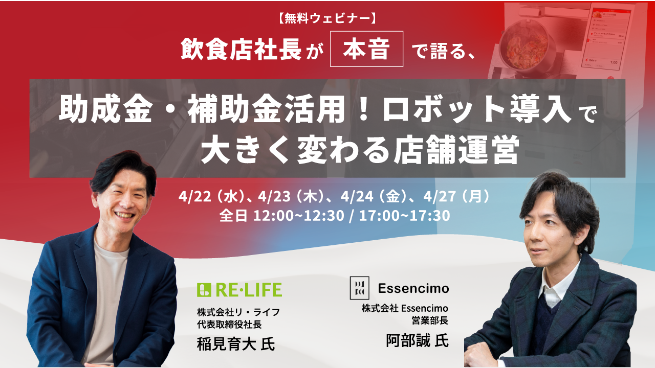 本ウェビナーでは、炒め調理ロボット「I-Robo 2」を実際に導入した中華料理店「Lei can ting」を運営する株式会社リ・ライフ 代表取締役社長 稲見育大氏をゲストに迎え、助成金を活用した導入の経緯や、申請から運用開始までの実体験を紹介します。さらに、補助金・助成金活用支援を手がける株式会社Essencimo 阿部誠氏が登壇し、制度の仕組みや活用のポイントについて解説します。