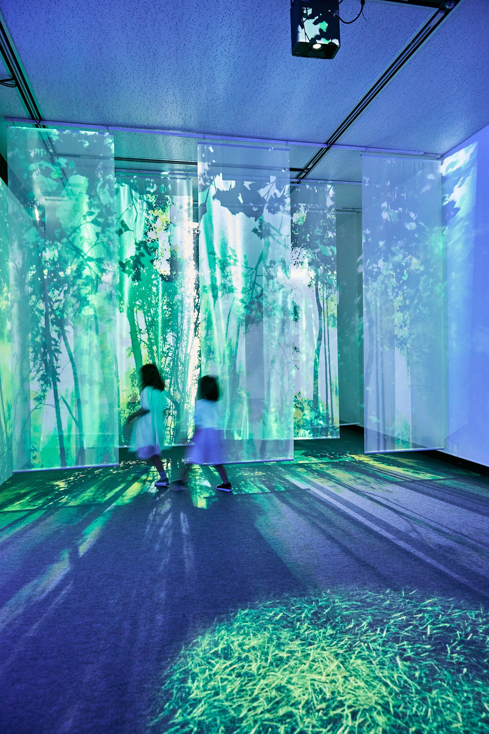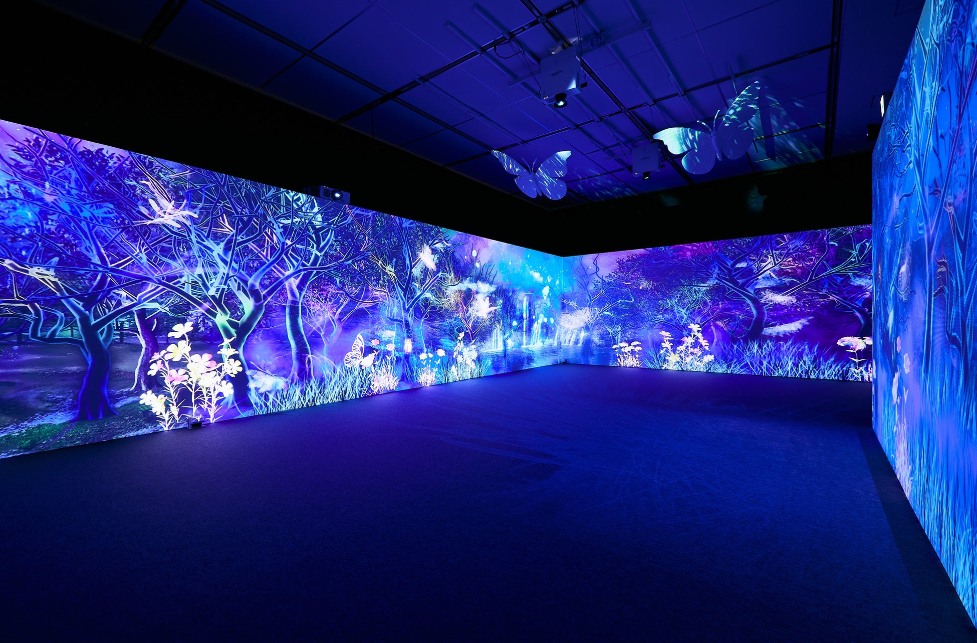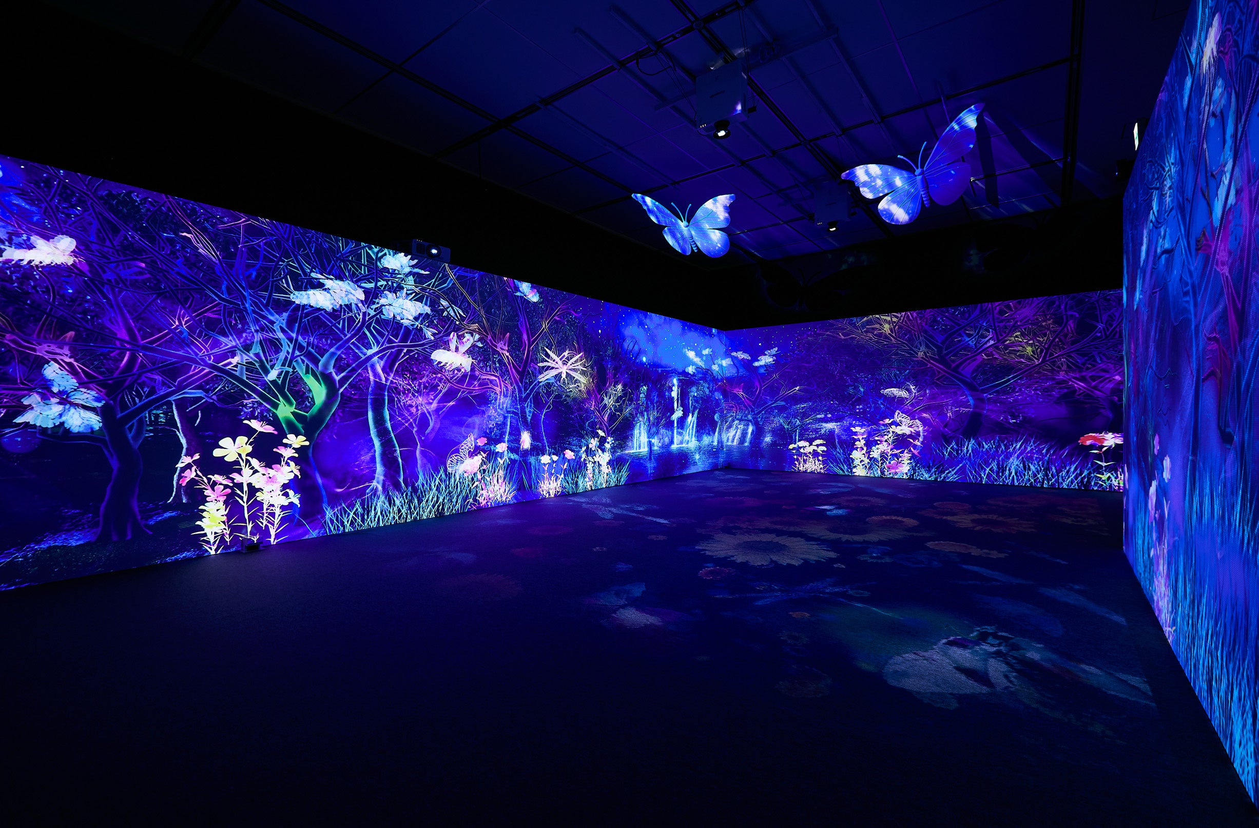 今回の企画は大規模な展覧会でのプロジェクションマッピング空間演出で、10台のプロジェクターを使用した壁面・床面・紗膜・立体造形の蝶の映像空間と、人の動きに合わせて映像が変化するインタラクティブシステムを使用した床面での遊びの要素を織り混ぜ、「体感する昆虫展」にふさわしいアクティブな体験価値の創出を目指しました。