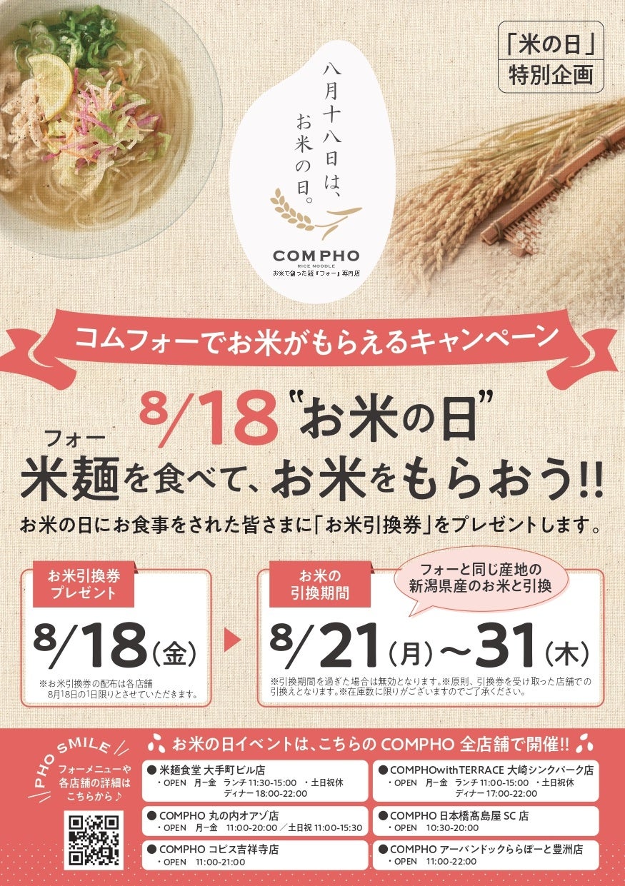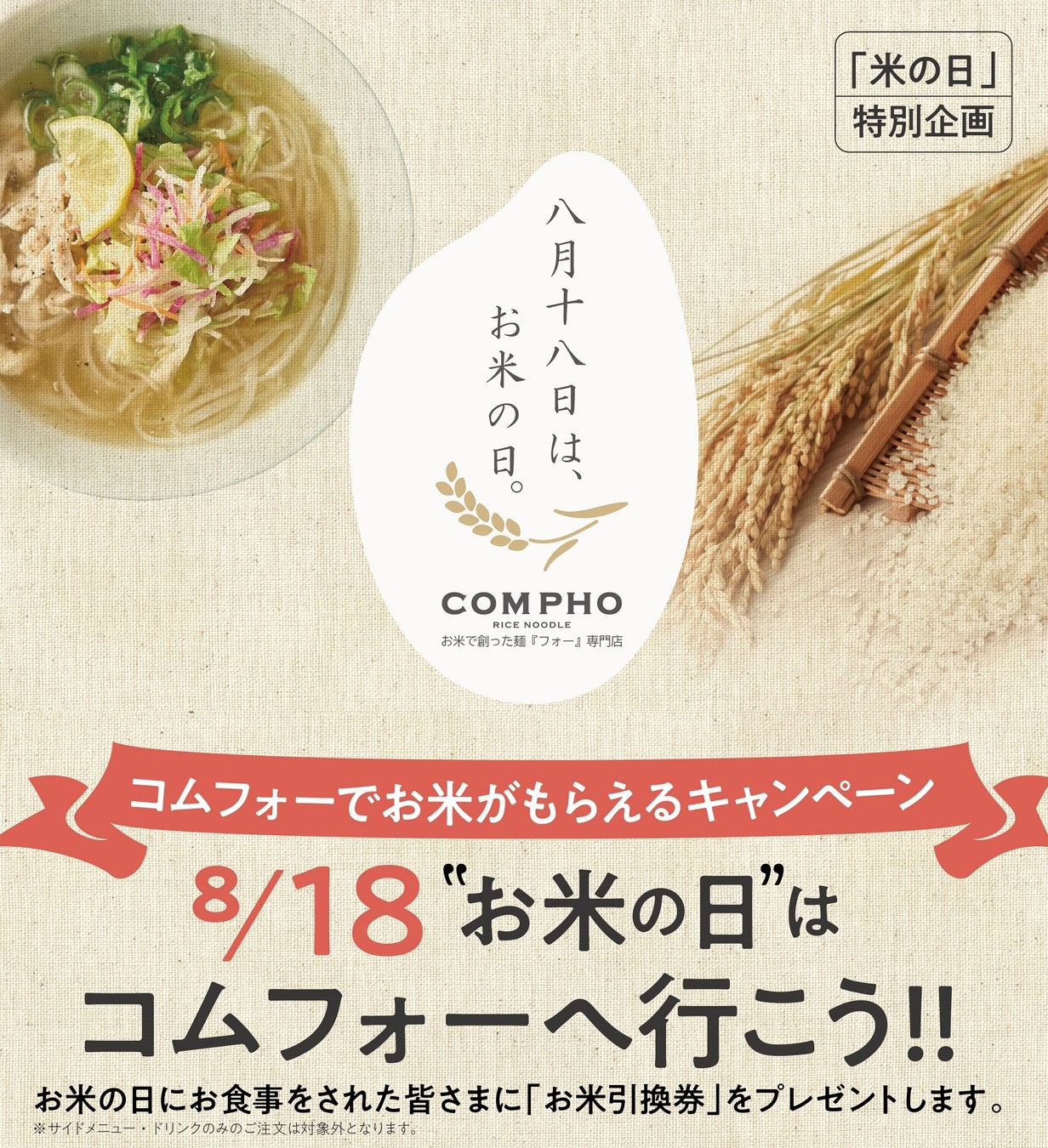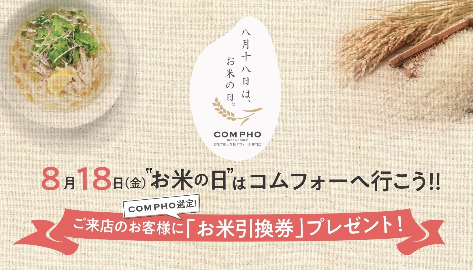 8月18日(金)はお米の日!フォーを食べて米をもらおう!コムフォーへの来店でお米引換券をプレゼント