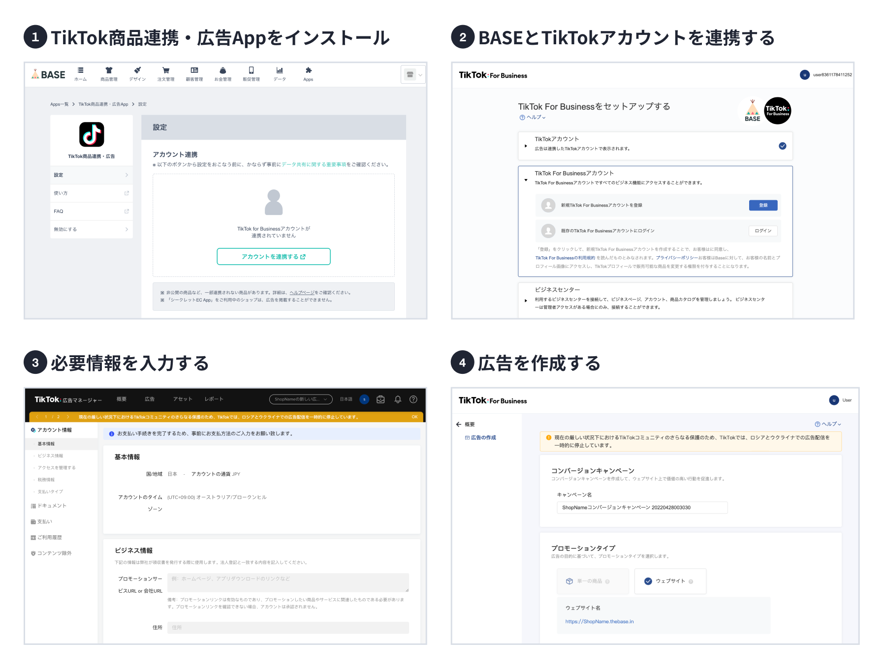 なお、通常TikTokへ広告を掲載するには自身でTikTok広告アカウントの設定、および商品情報の登録を行う必要がありますが、本機能を使うと、「BASE」内に登録されているショップや商品データが自動で連携されるため、自身で設定・登録するよりも少ない手順でセットアップすることが可能です。