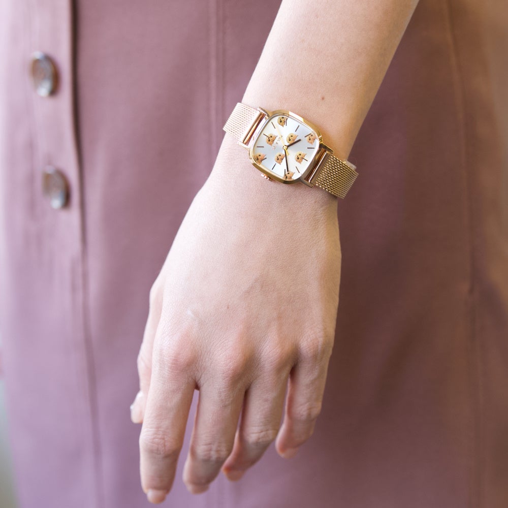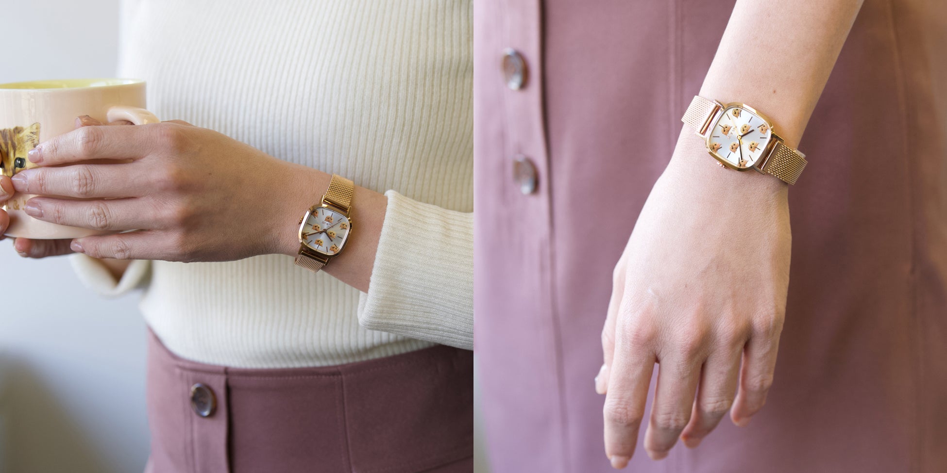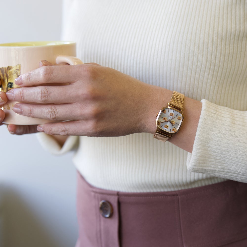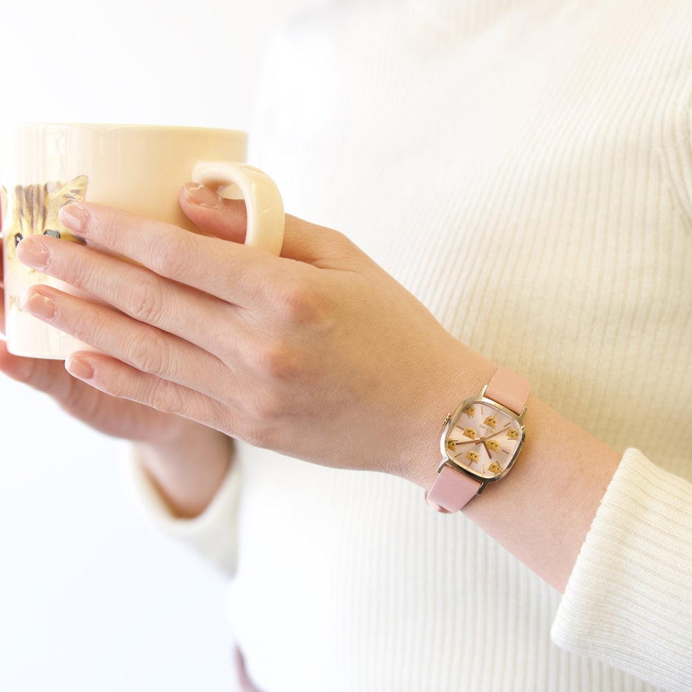 クラシックなスクウェアケースに、猫のヌネットがプリントされたダイアルを組み合わせたファン待望の新作は、レザーストラップとメッシュブレスレットにて展開され、それぞれが販路限定で販売されています。