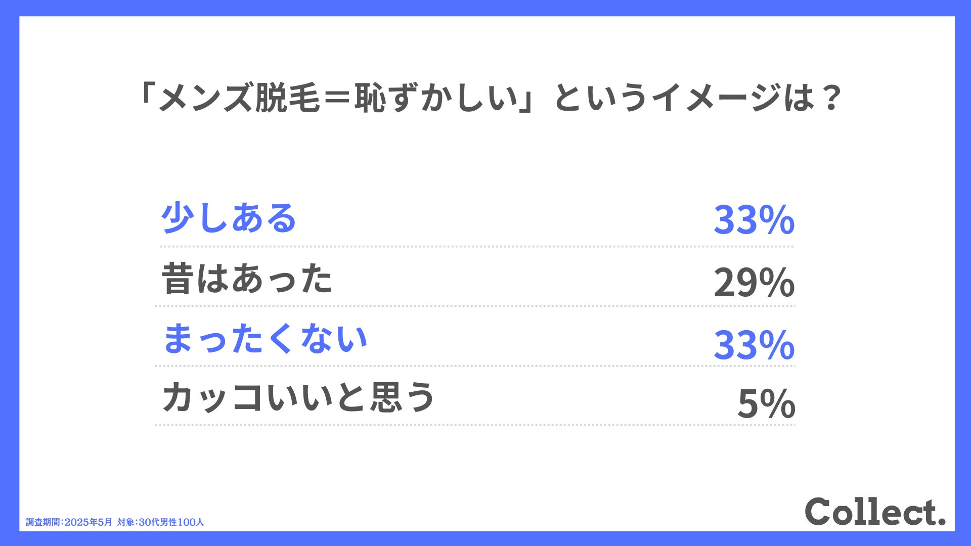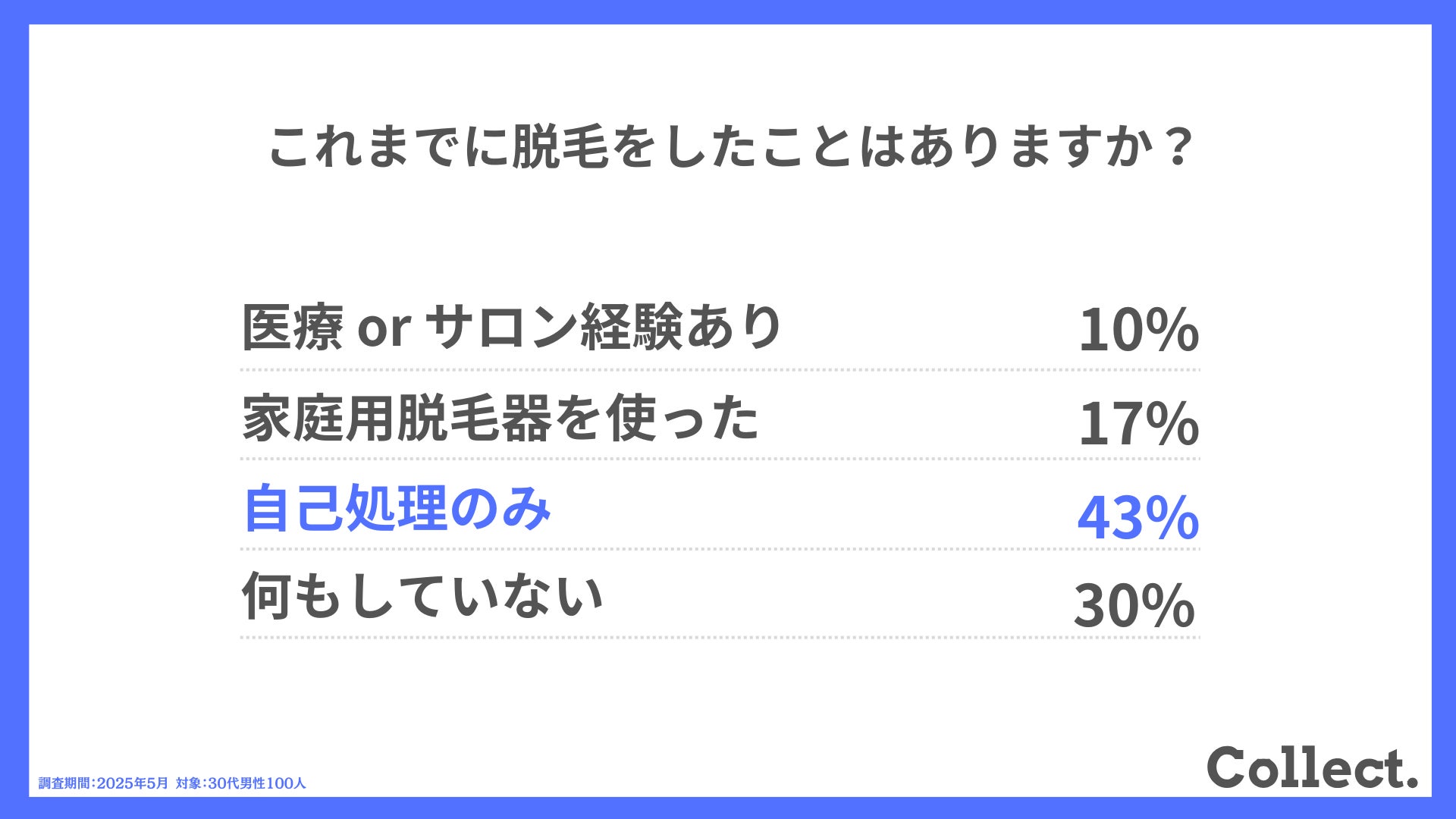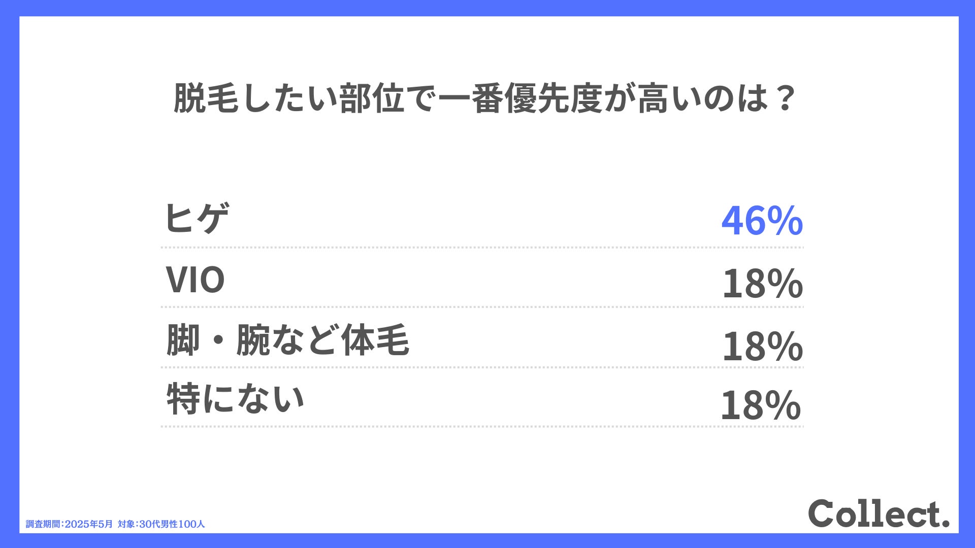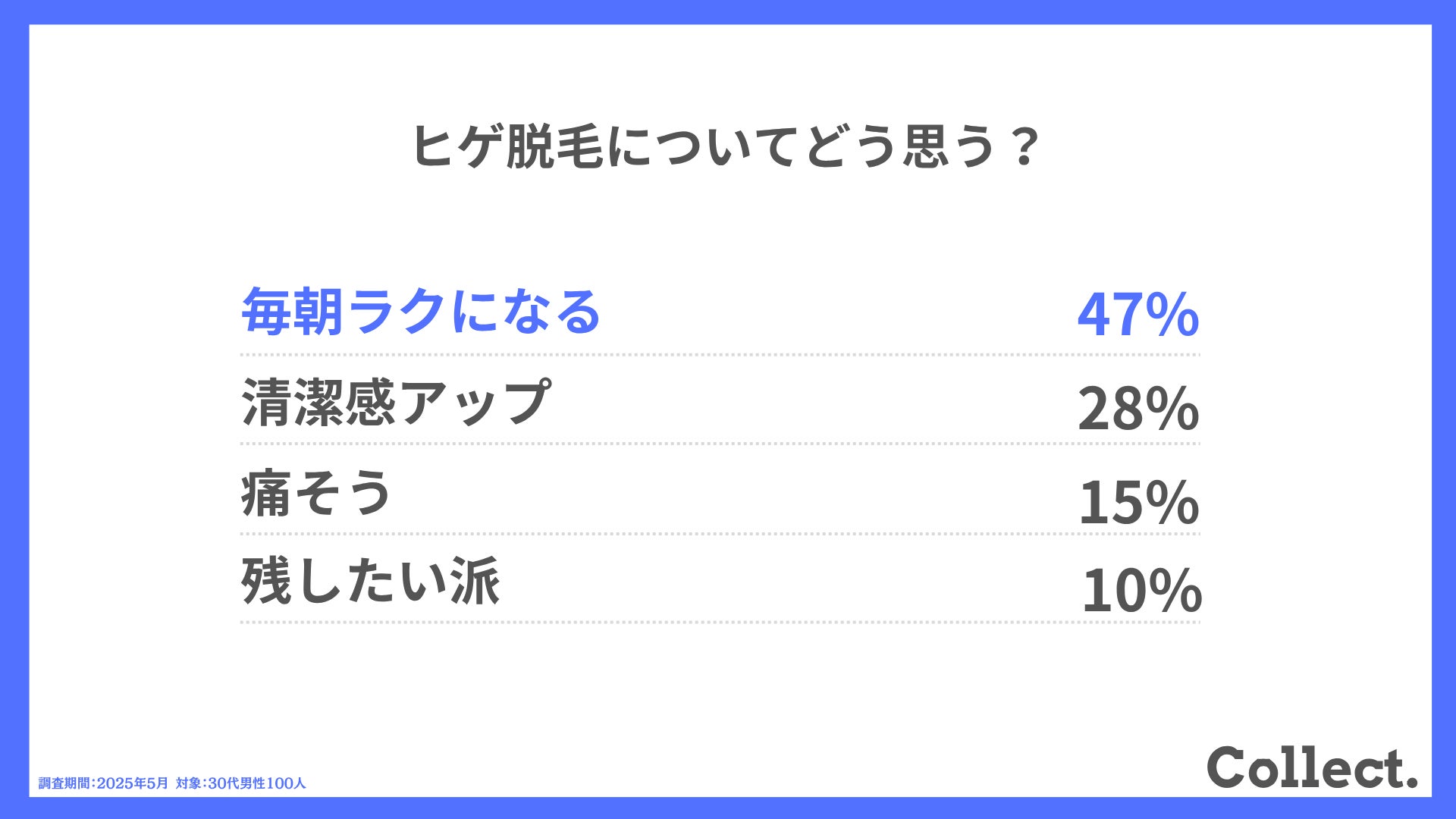 本アンケート結果や画像をご利用いただく際は、引用元として「Collect.(コレクト)URL(https://www.dm-s.co.jp/collect/mens-hair-removal-list/)」へのリンク設置をお願いいたします。